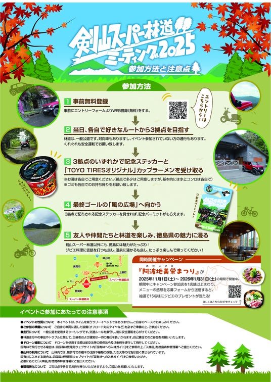 ●イベント概要:日本一長い林道「剣山スーパー林道」をクルマ、バイク、自転車、徒歩それぞれのペースでゆったりと景色を楽しみながら走行し、設定された3拠点(『ファガスの森 高城』、『山の家 奥槍戸』、『四国山岳植物園 岳人の森』)のいずれかを通過して、風の広場を目指すスタンプラリー形式のツーリングイベントです。