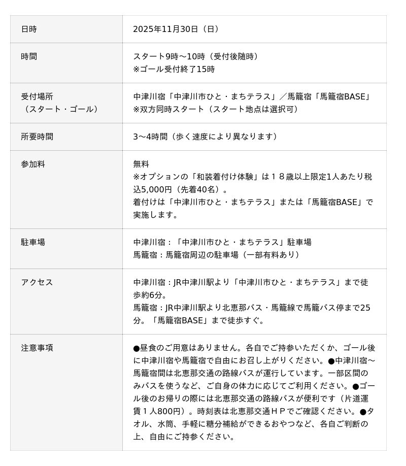 本イベントは、中津川市内にある3つの宿場町「中津川宿」「落合宿」「馬籠宿(まごめじゅく)」を結ぶ約8.8kmの中山道を、和装や旅装束で歩いて巡るというもの。もちろん普段着でもOKですが、有料オプションで「和装着付け体験」も実施しますので、ぜひ旅人気分で秋の中山道を歩いてみませんか?
