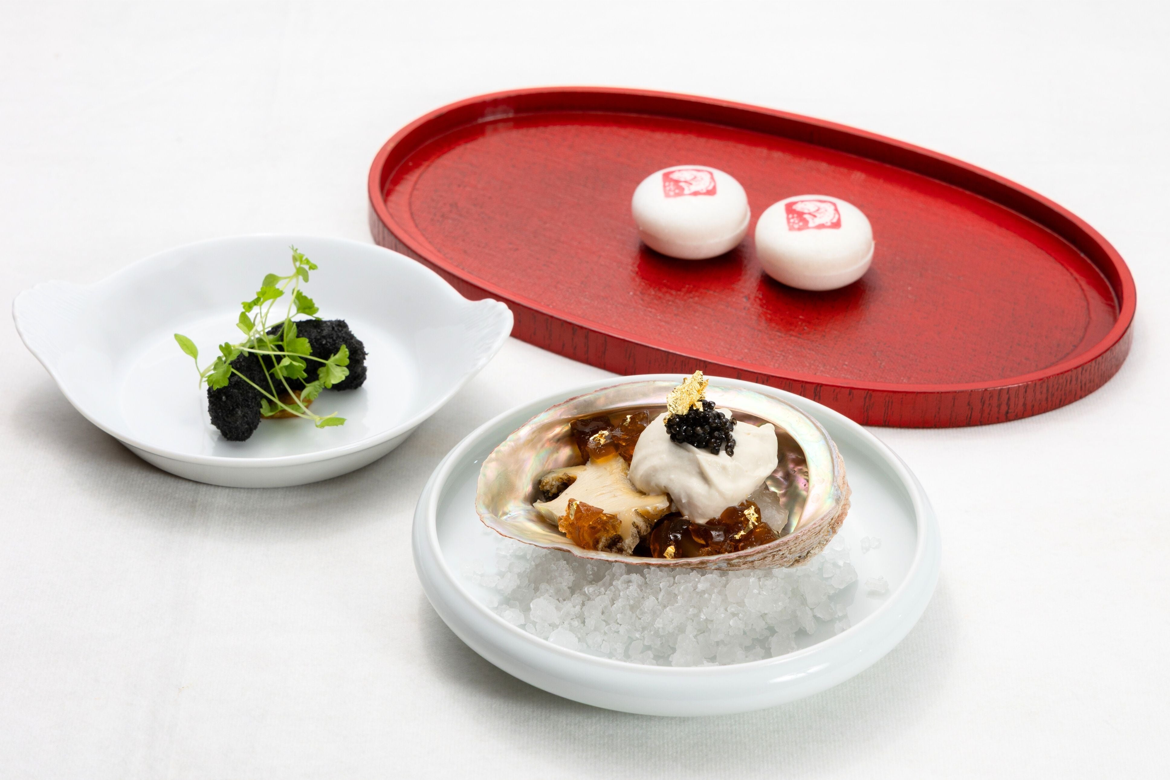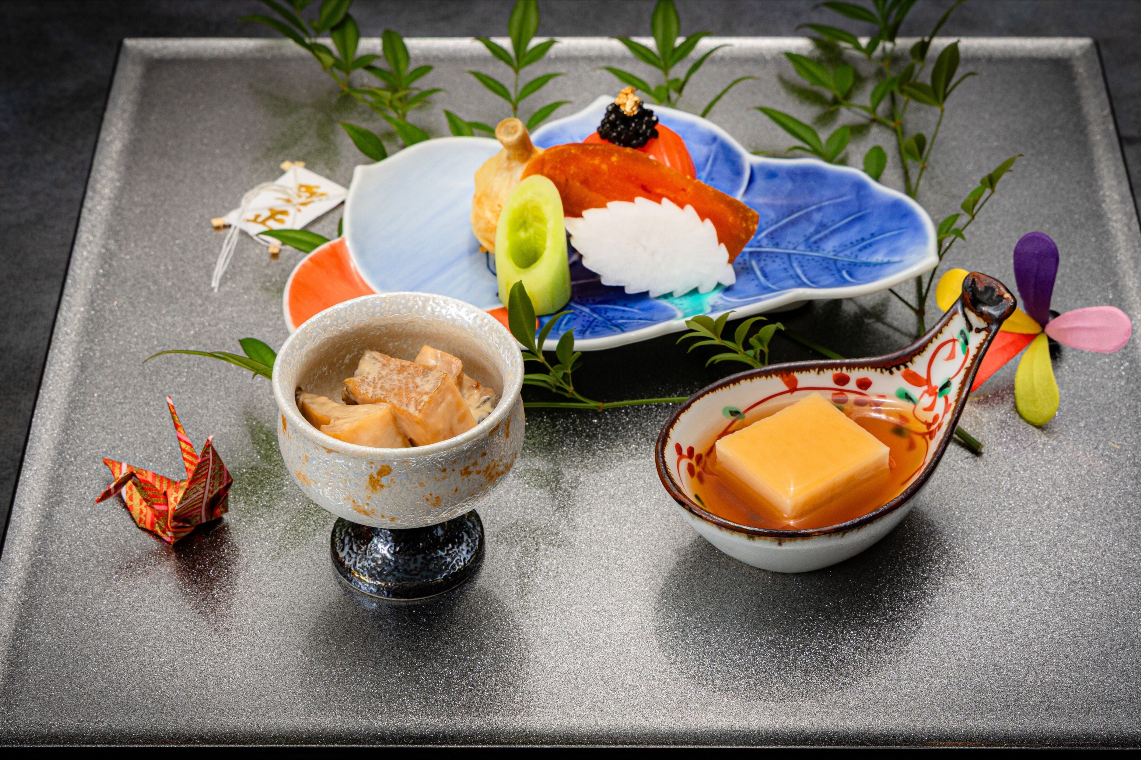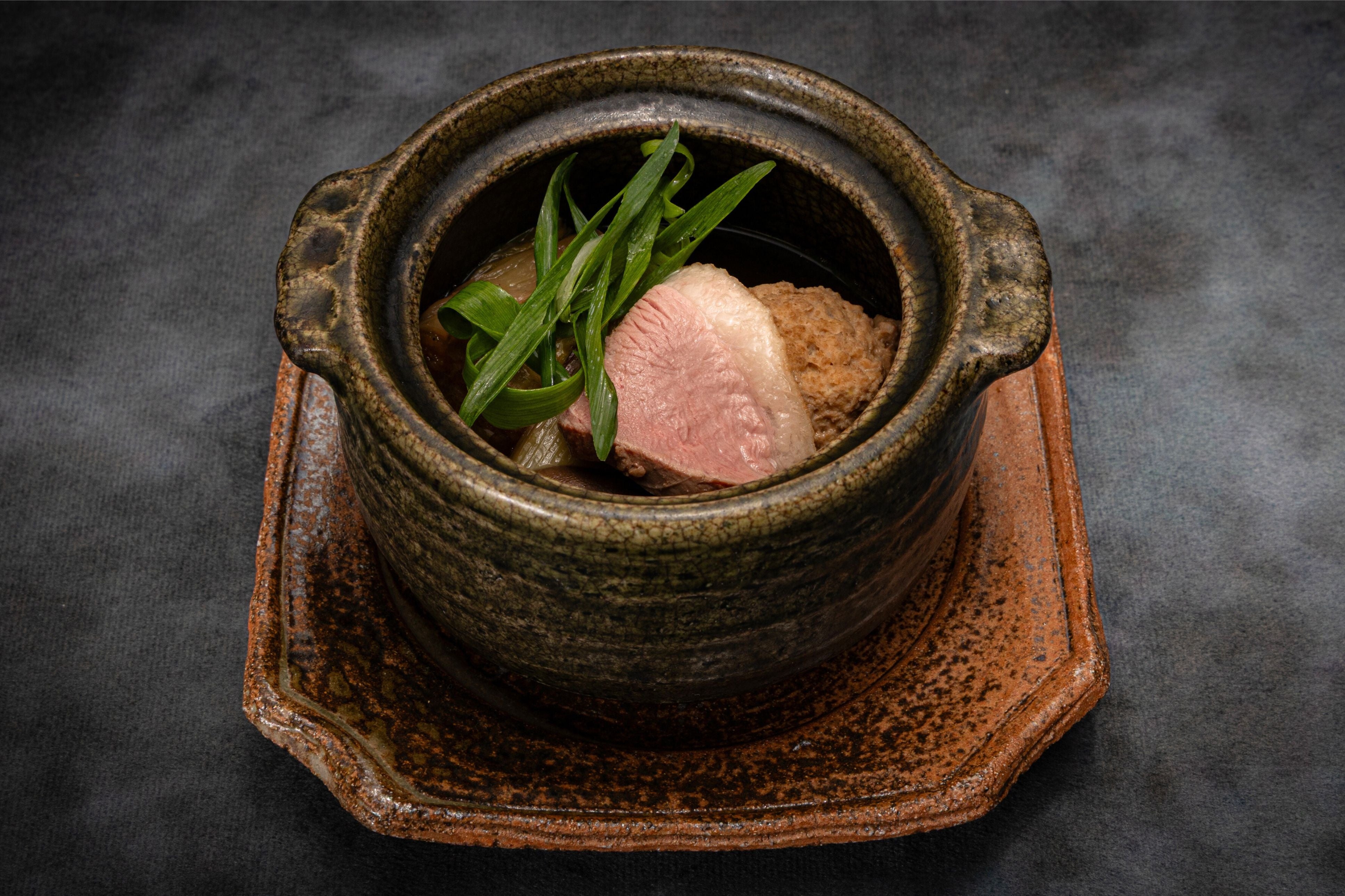 なかでも注目すべきは、富士山サーモンを使った手毬寿しに、約一か月かけて丹念に仕上げた自家製からすみを添えた前菜。祝いの席にふさわしい華やかさと、熟成による濃厚な旨味が魅力です。さらに、金目鯛真薯は、脂のりの良い金目鯛をなめらかに成形し、本枯れ節と利尻昆布で取った一番出汁とともに、香り高く仕上げた椀物。国産合鴨を使った団子とロースを、原木椎茸や九条葱など冬野菜とともに煮浸しにした台の物は、体を芯から温める一品です。