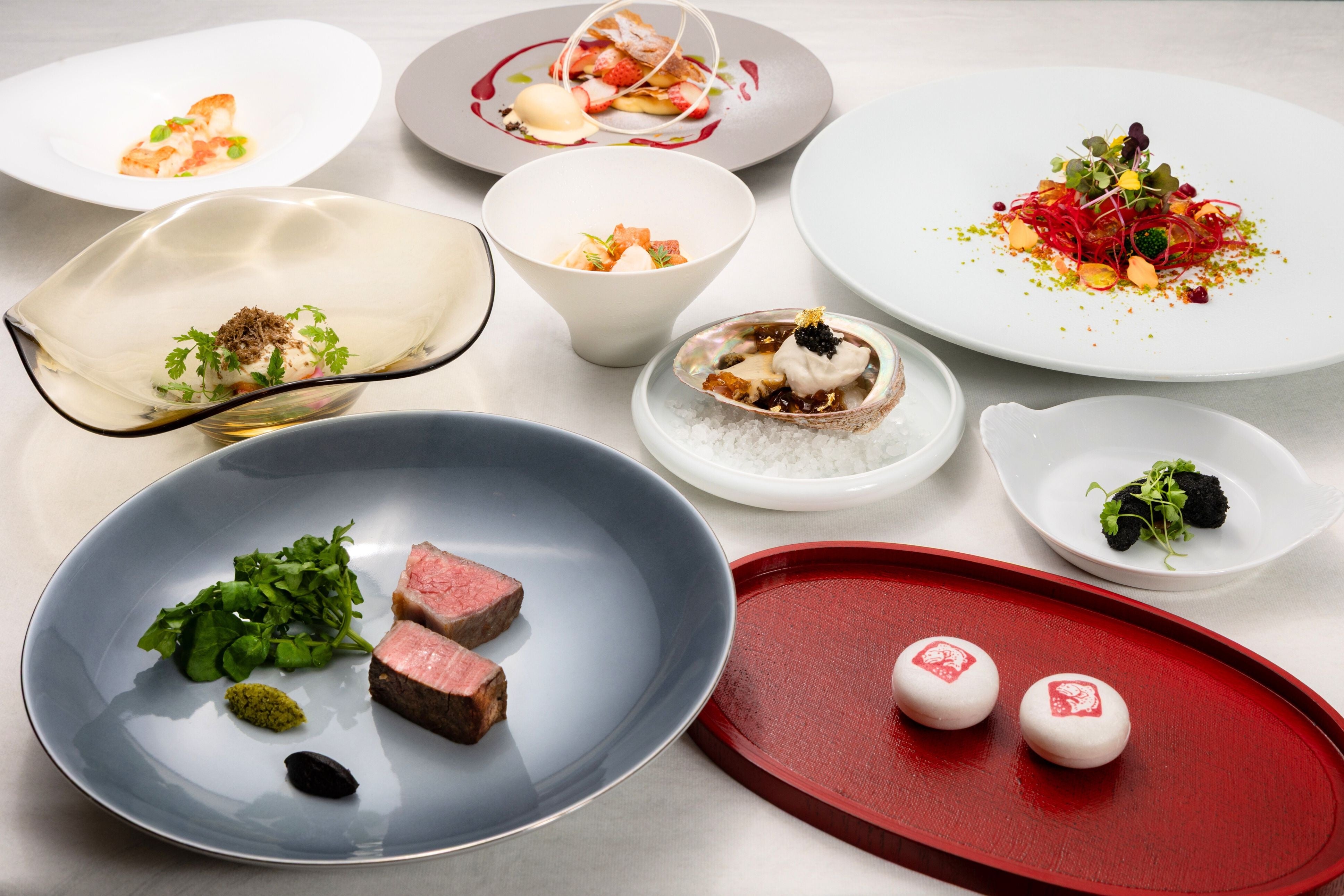 コンテンポラリーフレンチは、和と洋の技法を融合させた芸術的なコース。伊勢海老や黒毛和牛などの高級食材に、地元静岡の旬の恵みを加え、質の高い食材を楽しめる華やかな構成です。