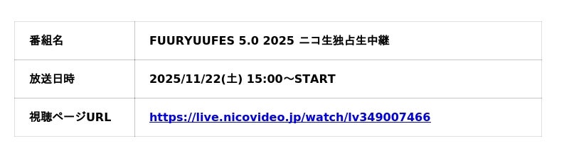 ニコニコ生放送では、11月22日(土)に行われる、リアルとバーチャルが融合する次世代フェス「FUURYUUFES 5.0 2025」で独占生中継いたします。ぴあアリーナMMで開催される国内最大級のVTuberフェスティバルを生中継配信でお楽しみください。