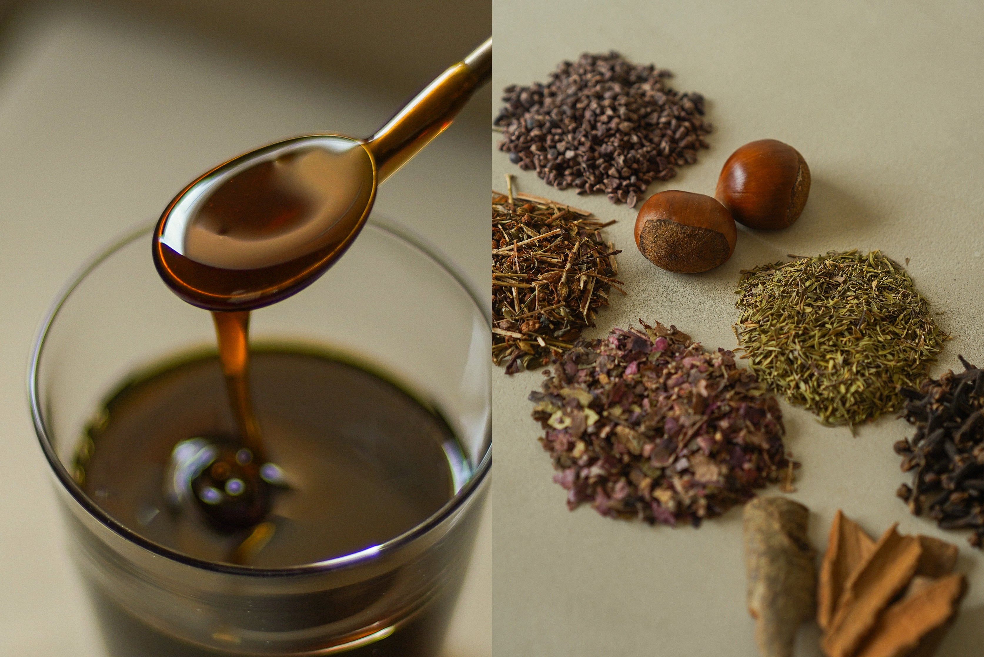 ハーブ・スパイスは、ワインの原料である葡萄の葉・レッドワインリーフをベースに、身体を温めるクローブやシナモン、冬のテーマである「CACAO」からカカオニブなどを調合。最後にラム酒で香りづけし、濃蜜な甘さと落ち着きのあるはちみつに仕上げました。