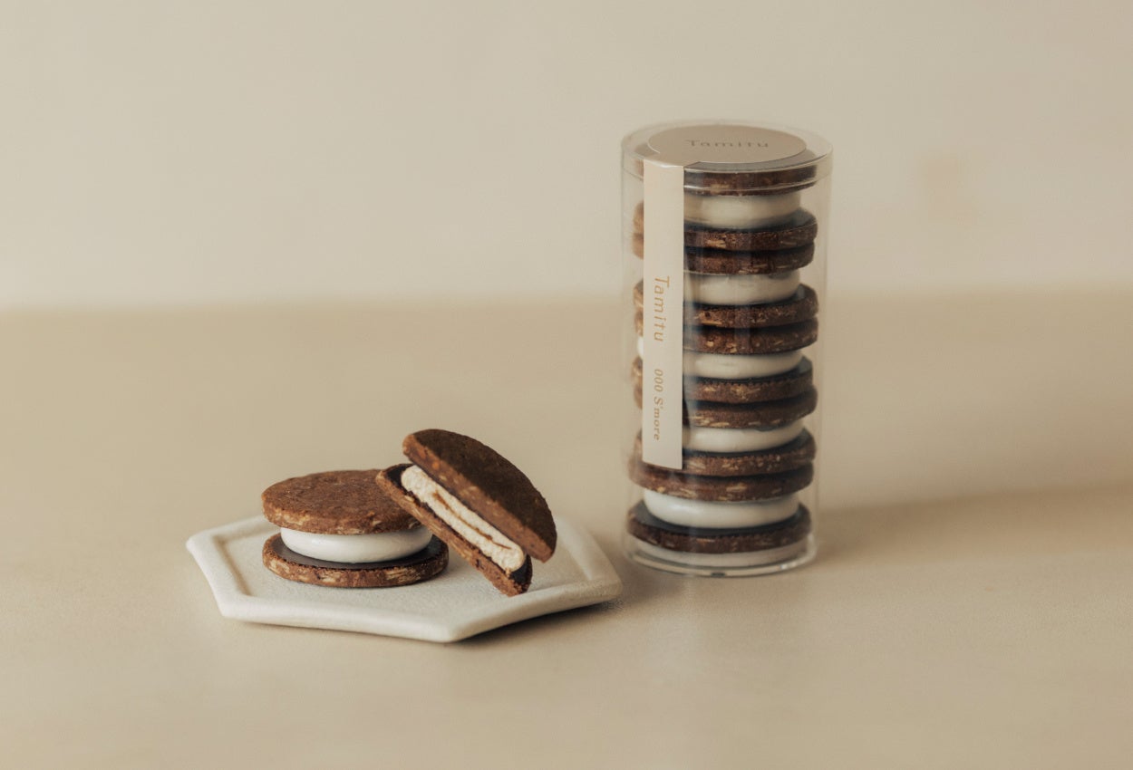 Herbal Honey 000を使った焼き菓子スモアが登場いたします。手がけたのはパティシエ・大塚陽介。柔らかなマシュマロの中にHerbal Honey 000を忍ばせ、繊細なココアクッキーで挟みました。ココアクッキーにはブラックチョコレートを塗り重ね、アーモンドスライスやカカオニブを加え小気味よい食感を演出。温めるとマシュマロがとろけだす幸せの食感をご堪能ください。