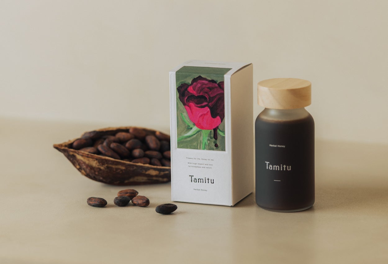 2022年冬に登場した「Herbal Honey Chocolat Rose」が新たな描き下ろしパッケージで限定復活いたします。Tamituのファーストフレーバーであるダマスクローズの「Herbal Honey 000」をベースに、カカオマスやカカオニブ、冬の身体を温めるシナモンなどを調合。甘いだけではない、華やかでちょっぴりスパイシーなショコラはちみつに仕上げました。