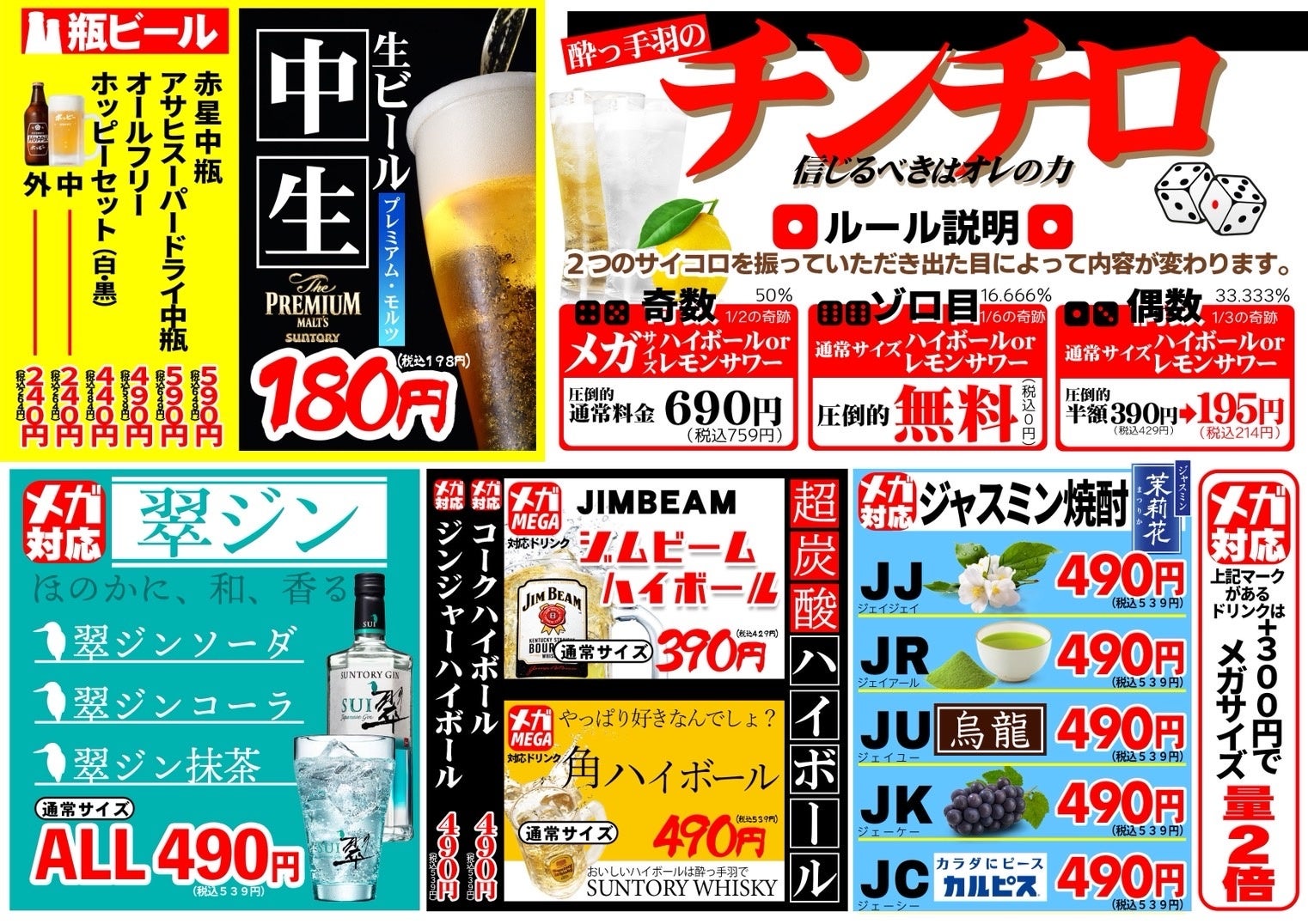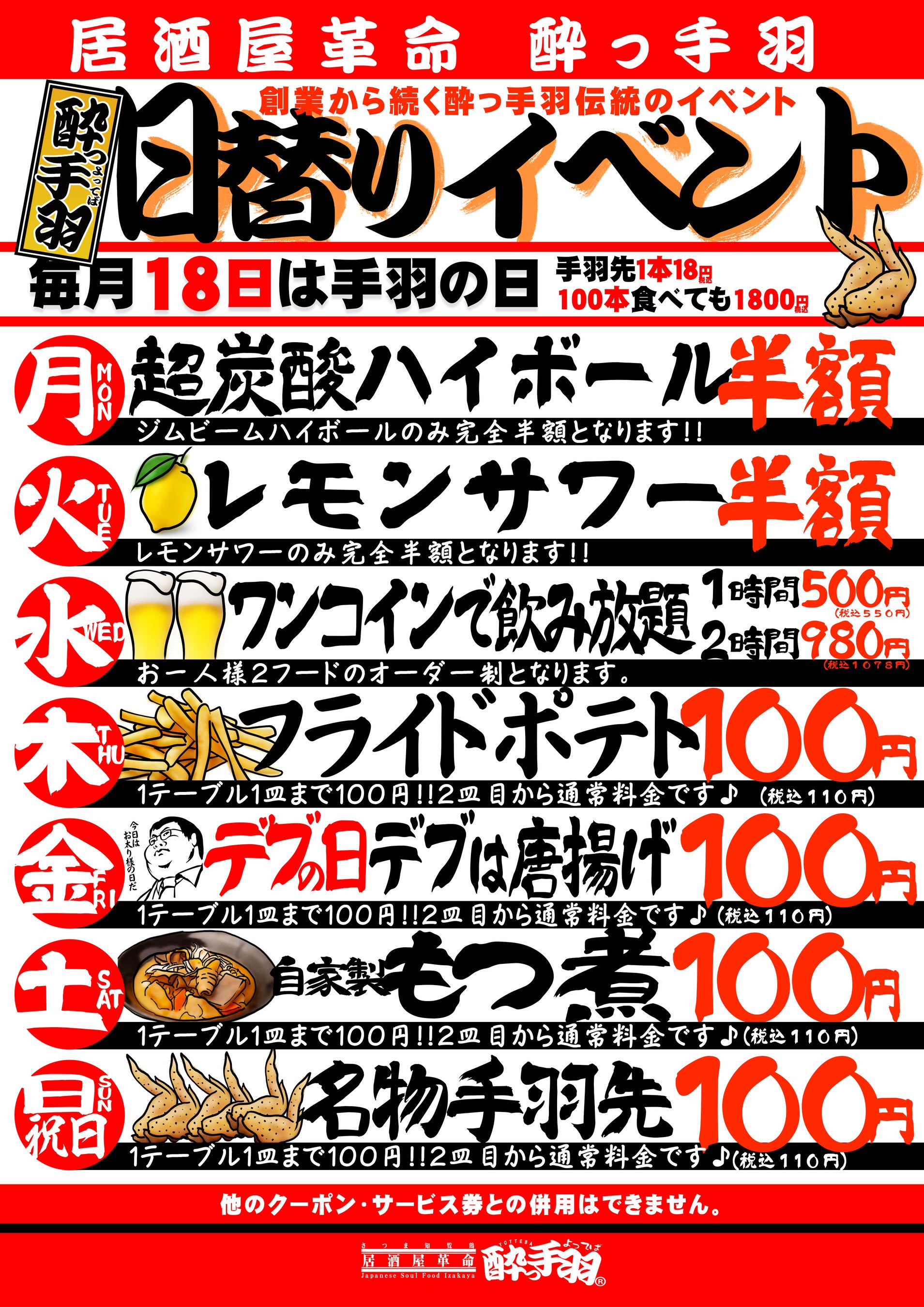 ハイボール半額やレモンサワー半額、飲み放題1時間500円、手羽先や唐揚げ100円など、日替わりの特売企画を「日替りイベント」と題して毎日実施しています。