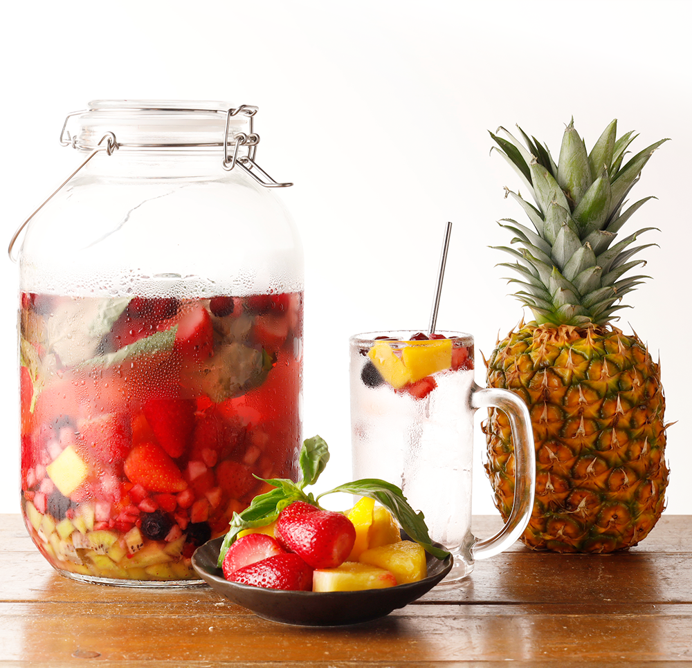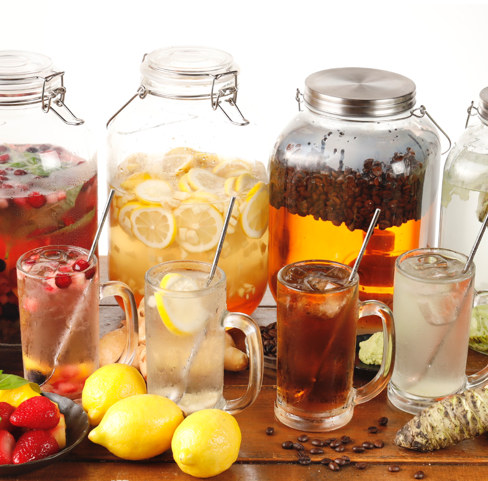 自家製「瓶漬け酒」は、焼酎にフレッシュな果実やコーヒー、わさび等をたっぷり漬け込み、素材本来の香りや味わいを引き出したこだわりのドリンクで、炭酸で割って爽やかに楽しめるサワーに仕上げました。