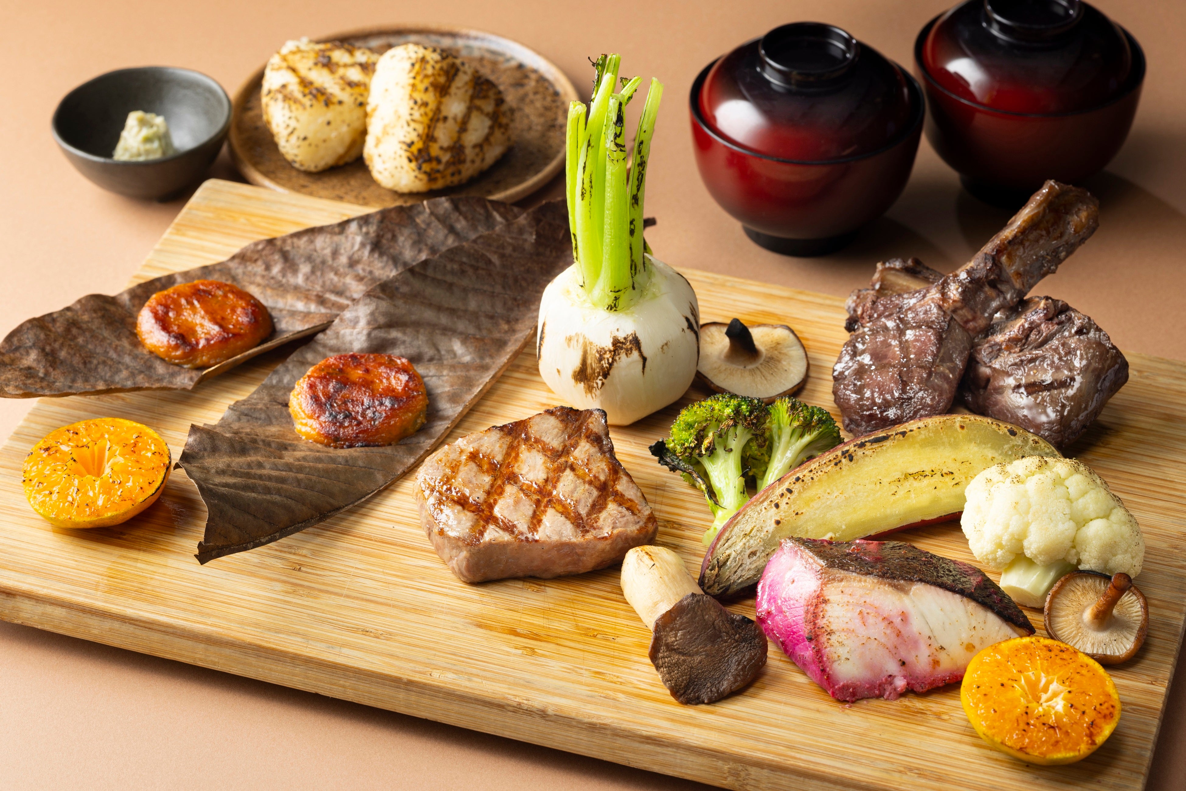 伊豆の自然で育まれた地場の食材をふんだんに使用し、シェアスタイルでご提供する伊豆マリオットホテル修善寺のディナーコース。寒さが厳しくなる冬の季節にぴったりな"免疫力"をテーマに、発酵食品をふんだんに取り入れた身体にやさしいメニューをご用意いたしました。コースの始まりには柚子を入れたミネラル豊富な観音温泉水に冬食材のピンチョスをしゃぶしゃぶ風にくぐらせて楽しむ"湯くぐり鍋"をヨーグルトソースで。メイン料理は、国産牛とイズシカのグリルと旬の魚のビーツヨーグルト焼きの他、伊豆味噌に長ネギや生姜、ごま油などを加え棒葉で香ばしく焼いた特製焼き味噌と甘さ引き立つ焼きみかんを添えた豪快な一皿に仕上げました。他にも焼き味噌と合わせていただけるように、メイン料理と同時に提供する焼きおにぎりや、チーズのコクとりんごの甘酸っぱさがマッチした冬にぴったりなデザート、アップルパイ&フロマージュアイスなど、温かみのあるメニュー全5品のコースになります。