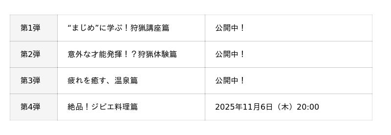 で展開中の「まじめなえひめ研究所」YouTubeチャンネル(https://www.youtube.com/channel/UCc5DAxVc0ypMwqXpiwb_rZw)の新作映像『【ネルソンズ・和田まんじゅうの愛媛狩猟体験#4】はちゃめちゃうまい!愛媛のジビエ料理に舌鼓!』を2025年11月6日(木)20:00より公開いたします。