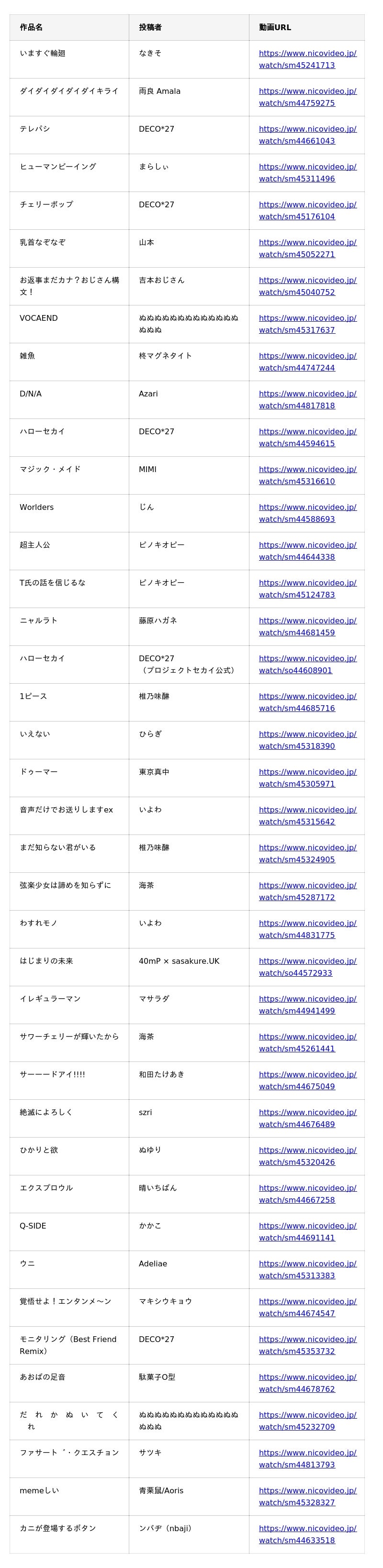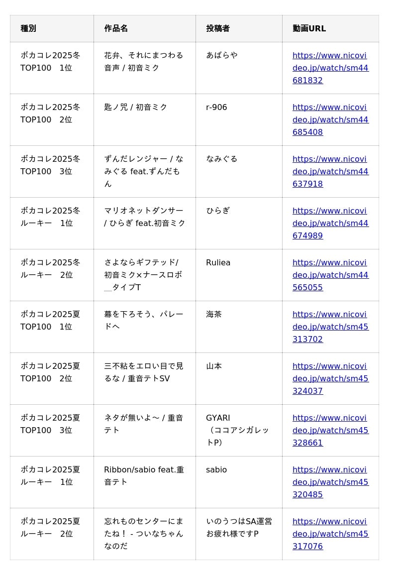 ・Billboard JAPAN「ニコニコ VOCALOID SONGS」:https://www.billboard-japan.com/charts/detail?a=niconico