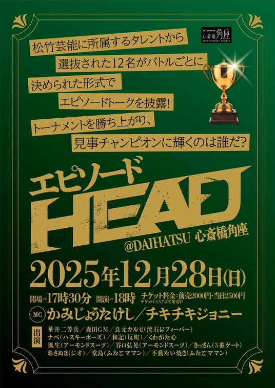 松竹芸能に所属するタレントから選抜された12名がバトルごとによって決められた形式でエピソードトークを披露し、チャンピオンを決めます。