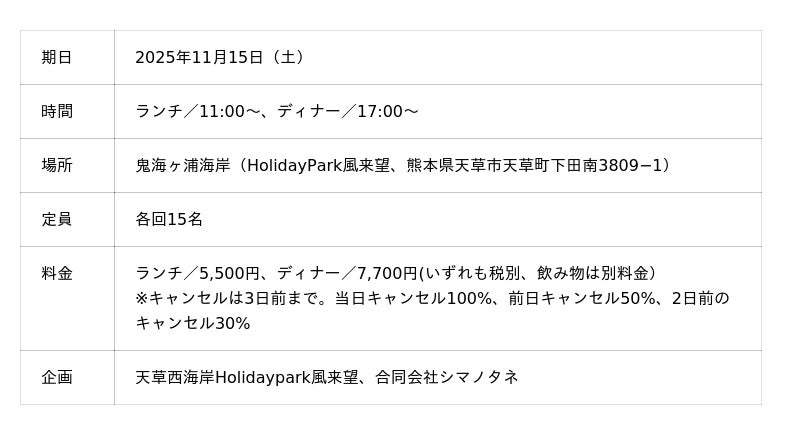 天草下島の鬼海ヶ浦集落に佇む「HolidayPark風来望」のオーシャンビューダイニングで、1日限りの特別なポップアップレストランが開催されます。天草の豊かな自然と文化に魅せられ、移住&U ターンした人々が「天草への感謝」を込めて企画する本イベントは、まさに"一期一会の食体験"です。