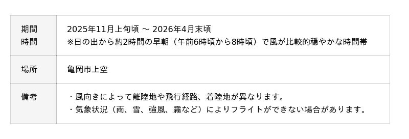 京都府亀岡市(市長:桂川 孝裕)は、2025年11月上旬から翌年4月末頃にかけて、市内上空で色とりどりの熱気球がフライトする、フライトシーズンがスタートしたことをご報告します。稲の収穫を終え、澄み渡る空気の亀岡の空に、大学の熱気球部、プロパイロット、社会人愛好家などが熱気球を飛ばし、年間を通して最も長く熱気球が空を彩ります。