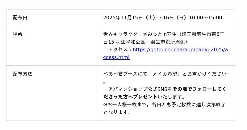 コラボ記念カードは、2025年11月15日(土)・16日(日)に開催される「世界キャラクターさみっとin羽生」のべあ~君ブースにて配布します(各日先着・なくなり次第終了)。
