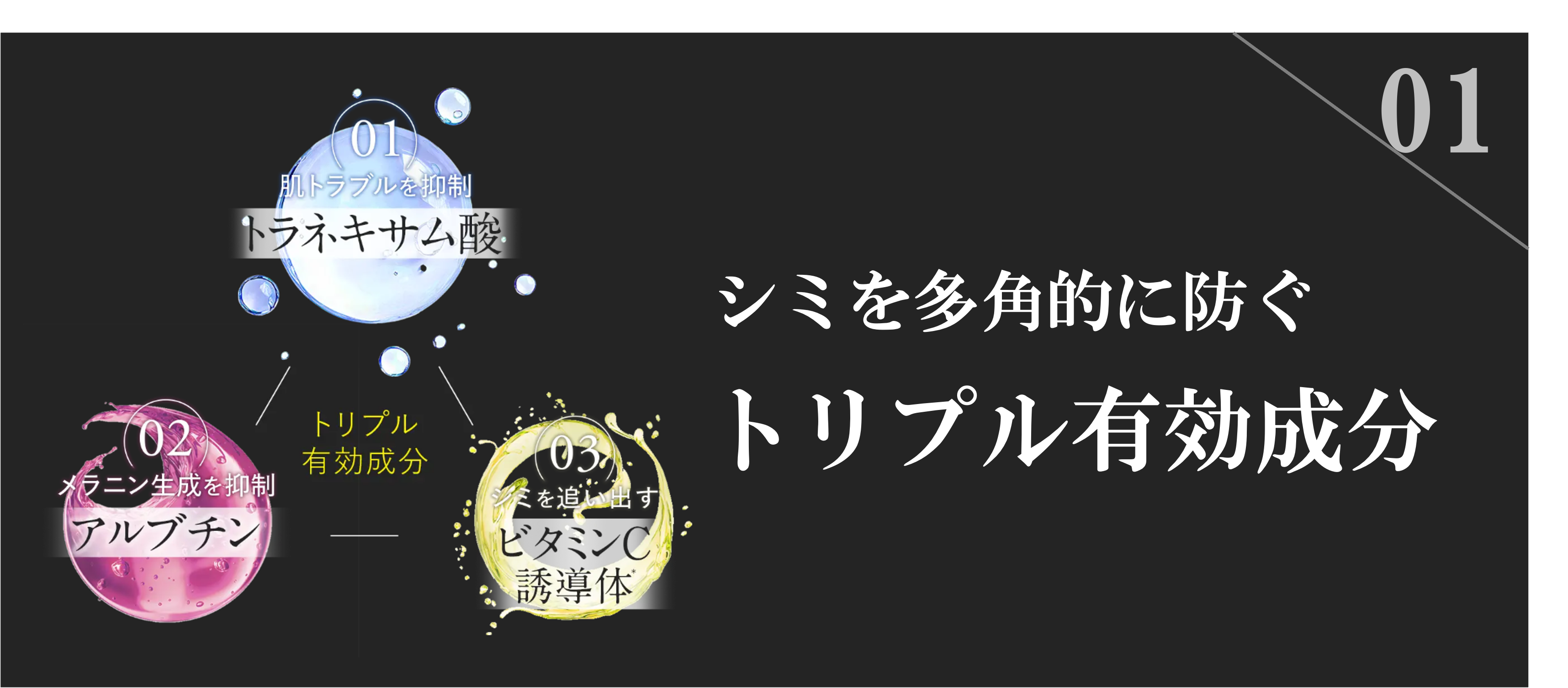 シミができるメカニズムを細分化し、シミができる工程の3ステップにアプローチする有効成分を贅沢に3種配合し、本気の美白(*2)ケアを叶えるべく開発した医薬部外品の美白(*2)美容液です。1本30mlの大容量で全顔にたっぷりお使いいただけます。