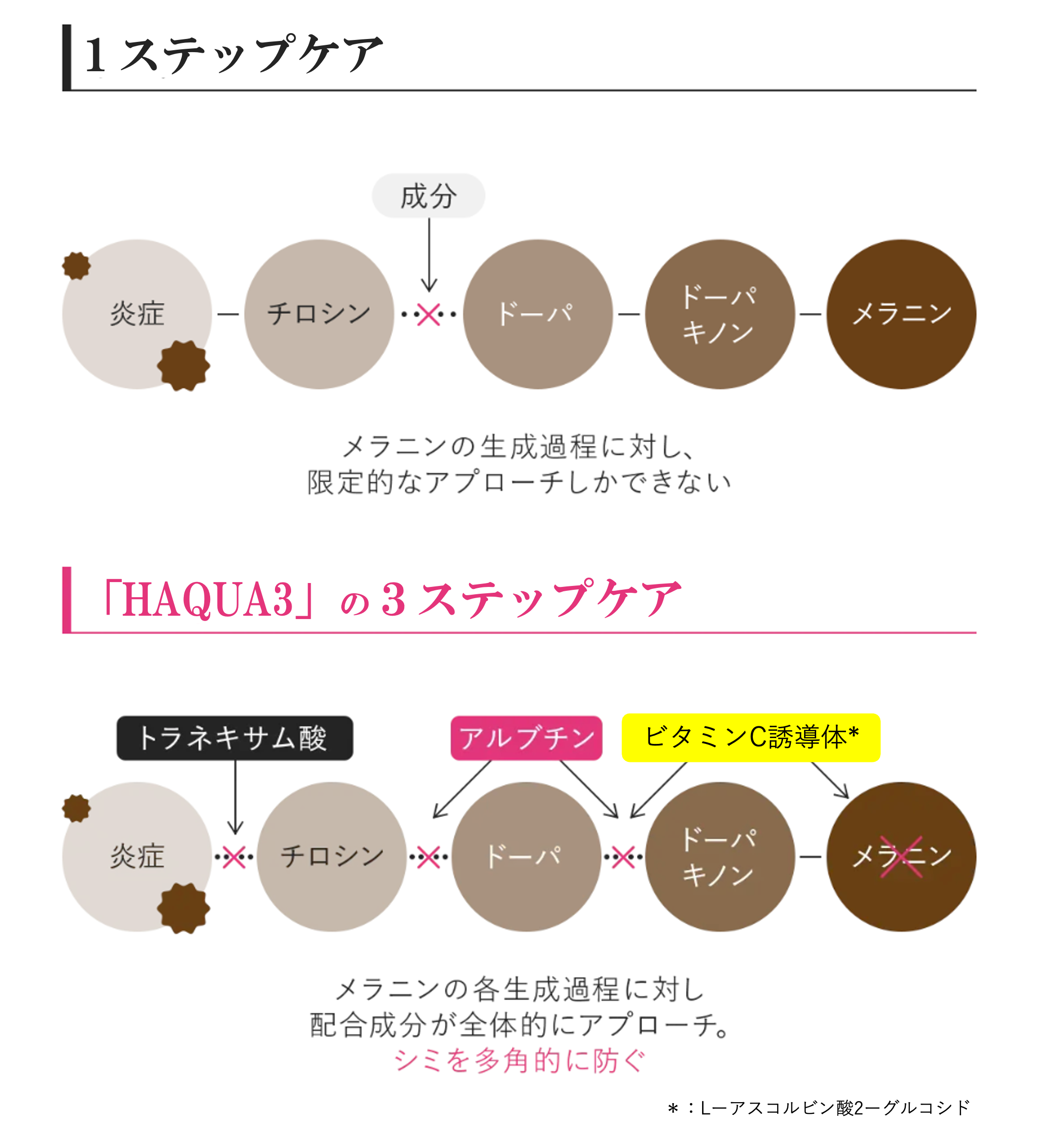 メラニンの生成過程へ限定的なアプローチのケアに対し、「HAQUA3」のステップケアなら、 ビタミンC誘導体(*)・アルブチン・トラネキサム酸のトリプル有効成分が、シミのもととなるメラニンの生成工程の3ステップにアプローチ。
