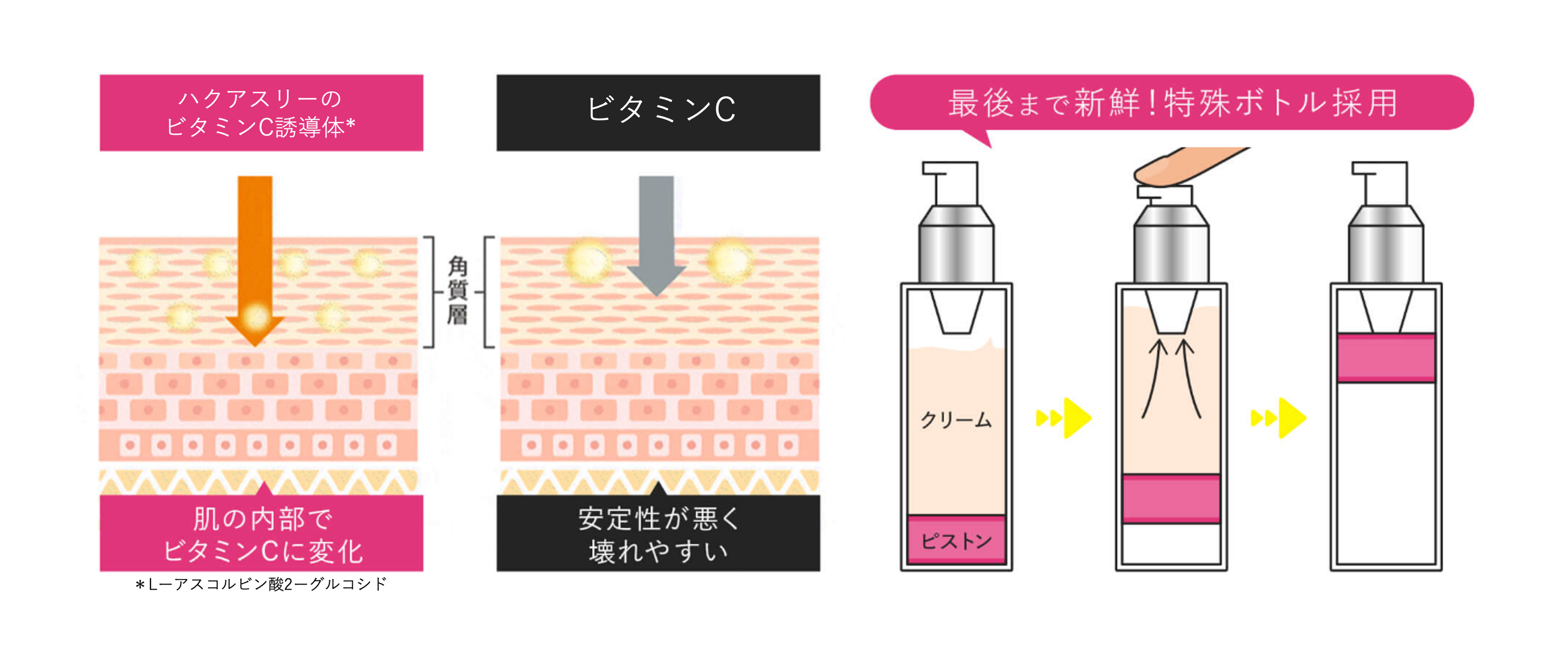 「HAQUA3」に配合されているのは、酸化しにくく安定性に優れた「ビタミンC誘導体(Lーアスコルビン酸2ーグルコシド)」。 空気や光に触れて劣化しやすいビタミンC(アスコルビン酸)の弱点を補い、肌の内部(*)に届いた後にゆっくりとビタミンCへ変化して作用。