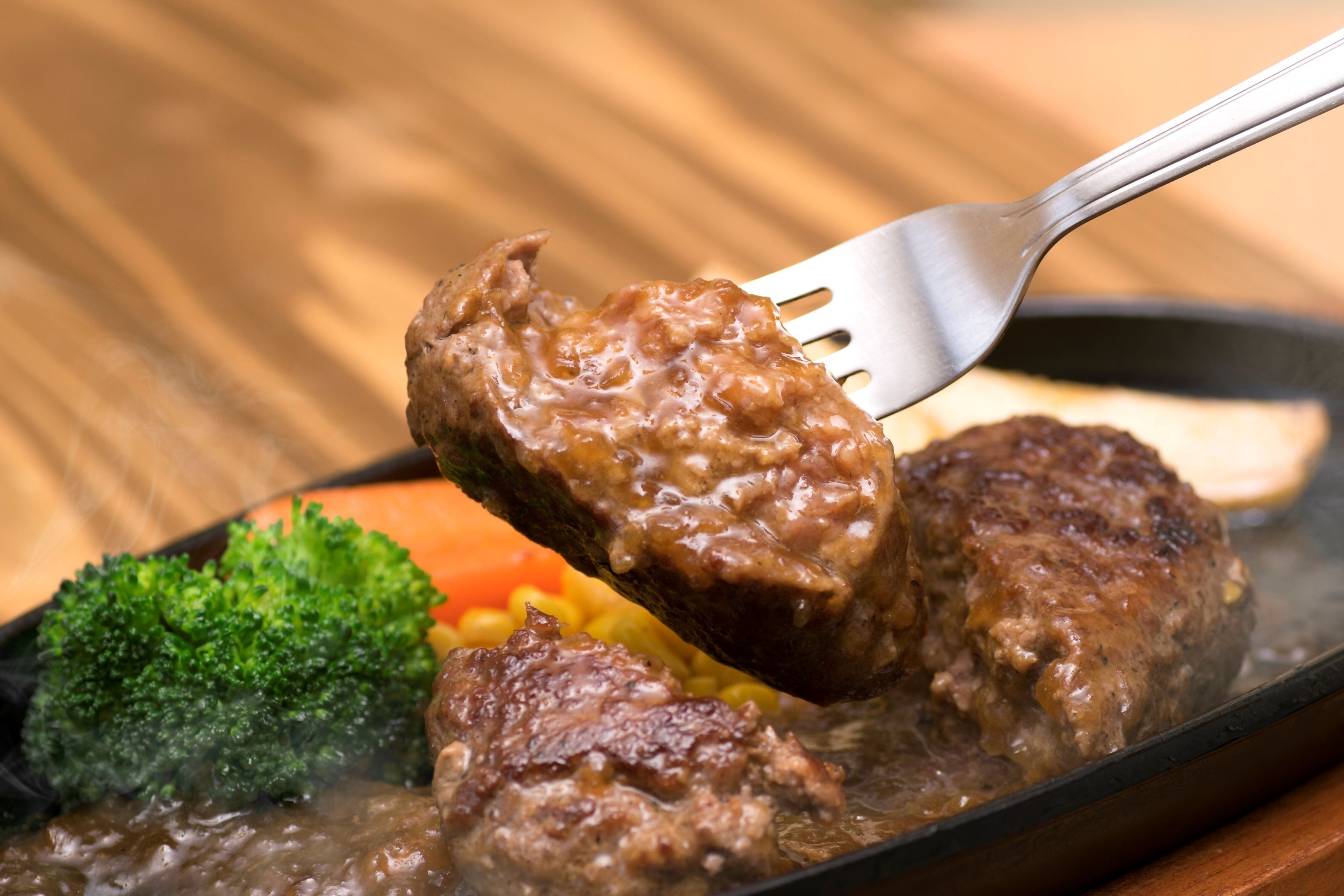 噛みしめるほど旨味があふれ出す自慢のハンバーグ。牛肉100%、つなぎは一切使用していません。上質な牛肉を粗挽きにすることで、ジューシーさと満足感が徹底的に追及されています。味付けは試行錯誤を繰り返し、牛肉の旨味を最大限に引き出すスパイスが独自配合されています。お肉好きな方には、たまらない逸品です。