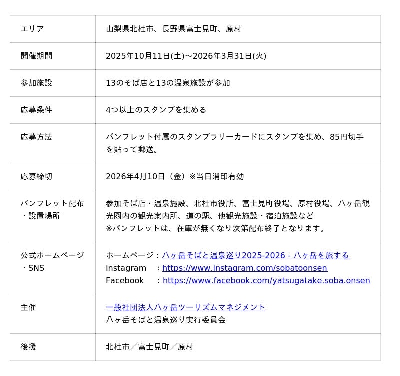 「1000mの天空リゾート八ヶ岳」をブランドコンセプトに、八ヶ岳観光圏(山梨県北杜市、長野県富士見町・原村)の観光地域づくりを担う一般社団法人八ヶ岳ツーリズムマネジメント(所在地:山梨県北杜市、代表理事:小林 勉)は、2025年10月11日(土)から2026年3月31日(火)まで、エリア内のそば店13店舗と温泉施設13施設を巡るスタンプラリー「八ヶ岳そばと温泉巡り 2025-2026」を開催しています。