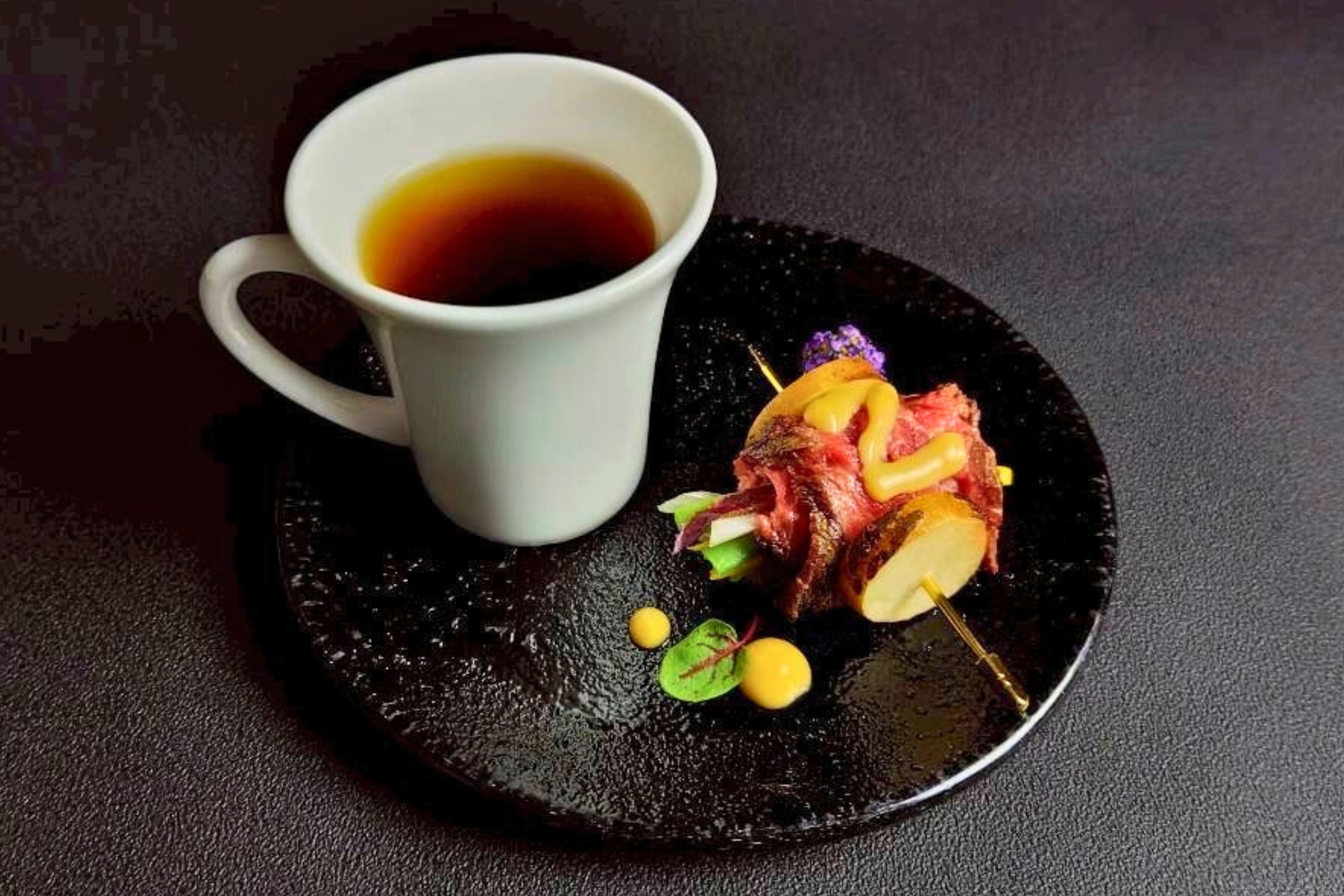 絶景メインダイニングのSAKURAからは、いい肉の日の牛肉のダブルアミューズとして「ローストビーフの"牛車Style"とオックステールコンソメスープ」をご来場のお客さまへプレゼント!