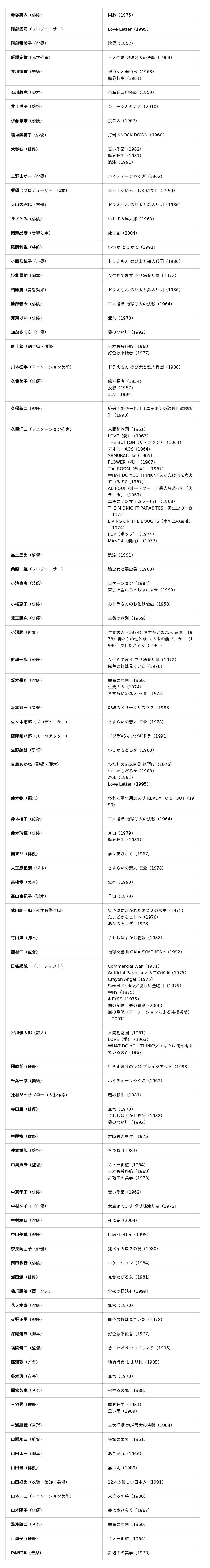 本特集で追悼する方々と上映作品(五十音順)