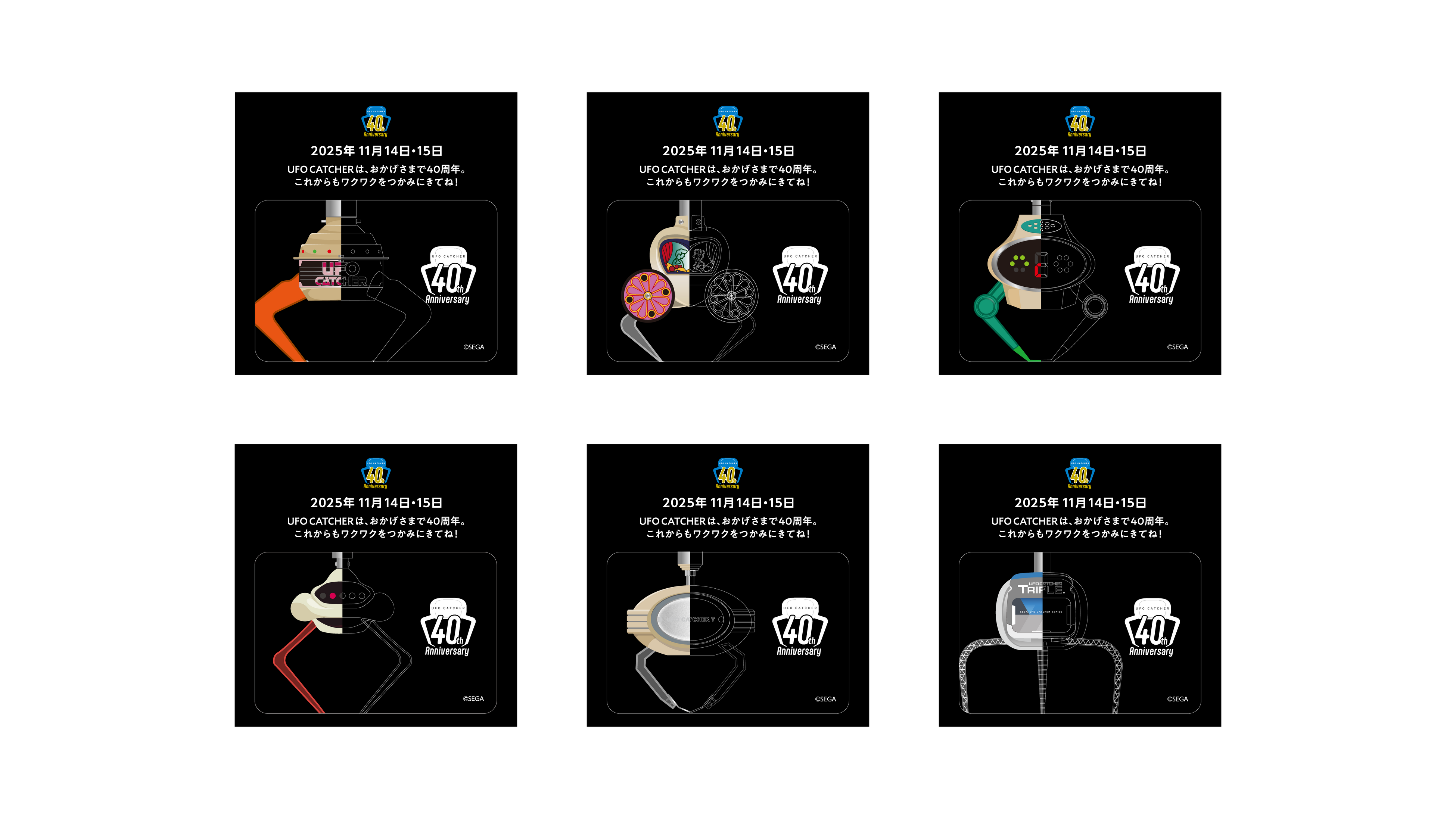 1985年の初代「UFO CATCHER」誕生から40年。さまざまな手法でその歴史を振り返る展示となっています。エポックメイキングなUFOキャッチャーシリーズの実機や年表の展示、アーム、コントロールパネル(通称:コンパネ)、プレイヤーの皆さんのUFOキャッチャーにまつわる想い出などを楽しく展示していきます。