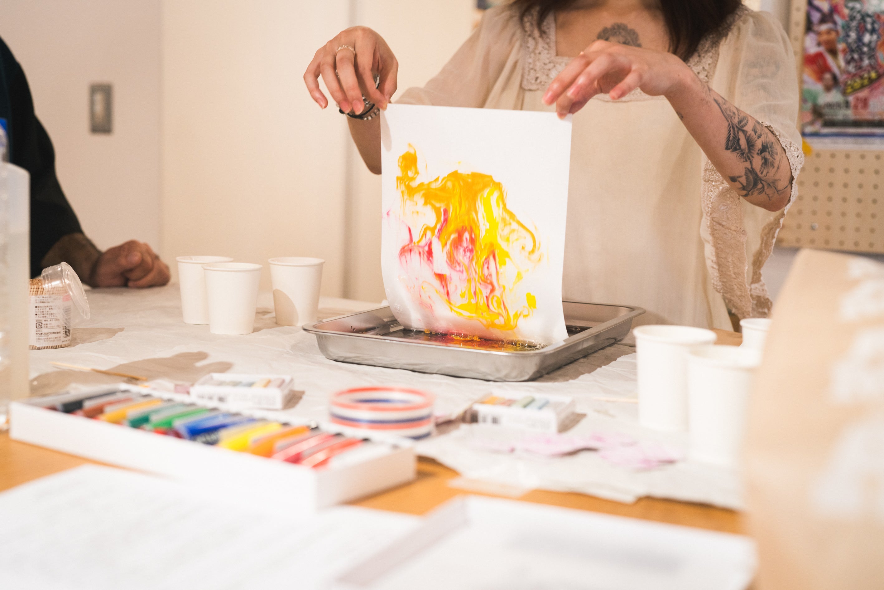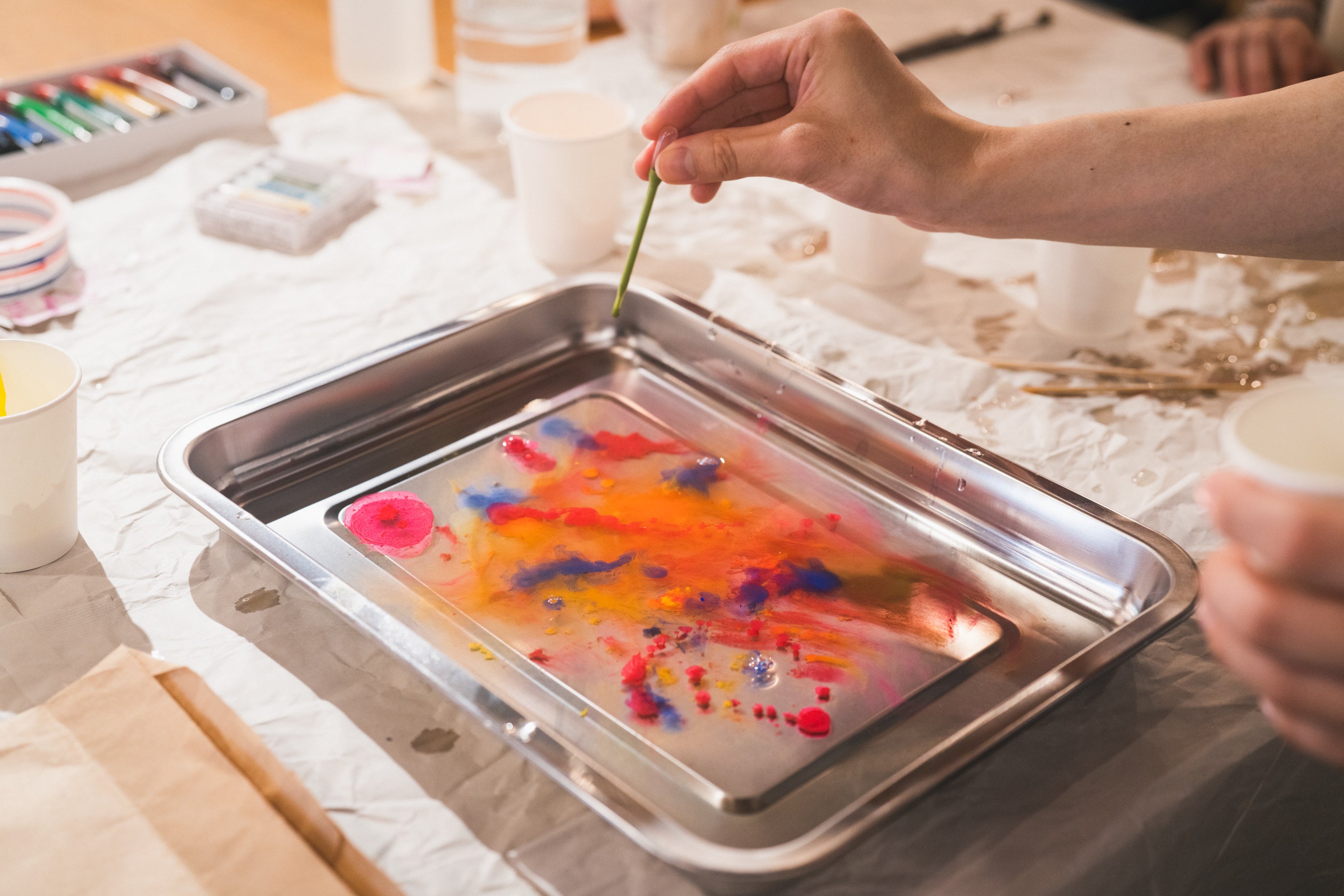 デザイナー監修のもと、紙へのマーブリングと、紙からしおりを切り出す作業を2回に分けて体験することができます。
