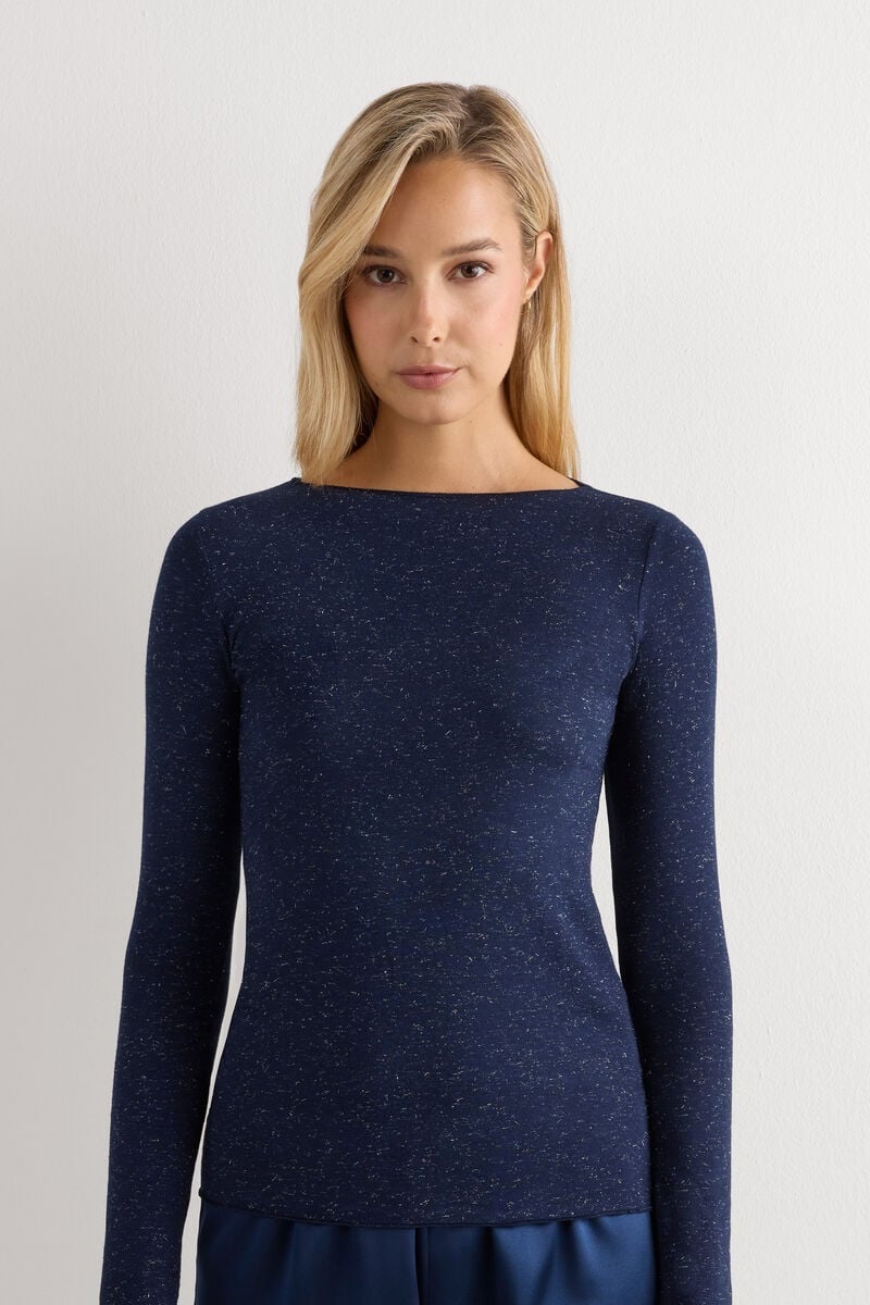 繊細なラメのきらめきが上品に映えるラウンドネックニット。柔らかな素材感で、日常のスタイルにさりげない華やかさを添えます。