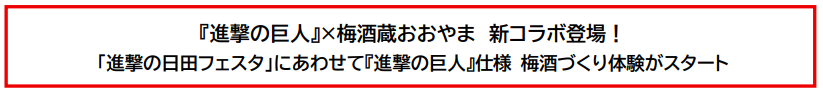 株式会社おおやま夢工房(所在地:大分県日田市大山町、代表取締役:土橋 泰輔)は、人気作品『進撃 の巨人』とコラボレーションした『進撃の巨人』仕様 梅酒づくり体験を、「進撃の日田フェスタ」の開催に あわせて 2025 年12月6日(土)より開始いたします。