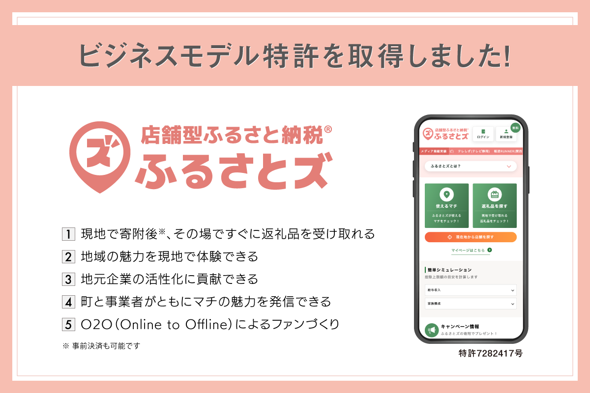 店舗型ふるさと納税(R)『ふるさとズ』は、2023年にビジネスモデル特許【特許番号:特許7282417号】を取得しています。ふるさとズは、「お得に」ではなく「地域に」ふるさと納税の可能性を広げるサービスです。