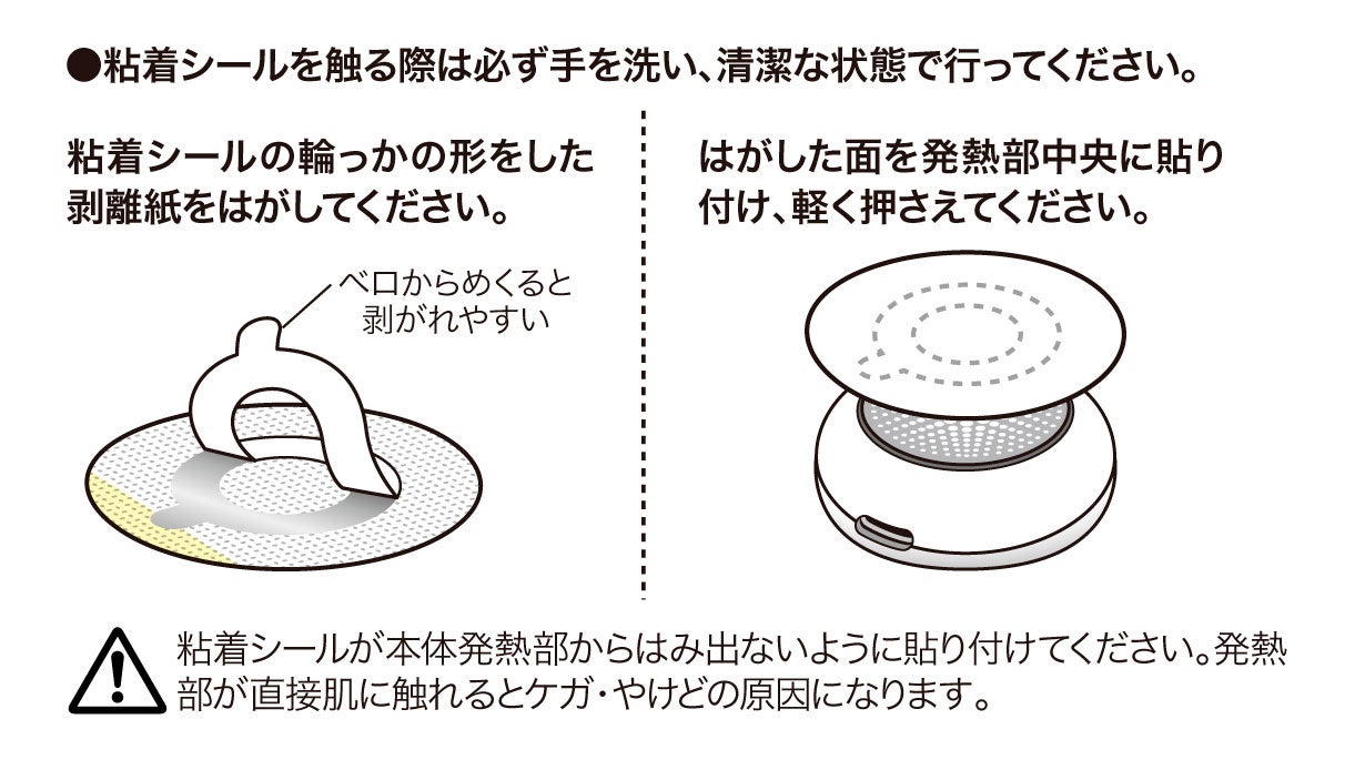 粘着シールの片側の剥離紙をはがし、本体の発熱部にしっかりと貼ります。
