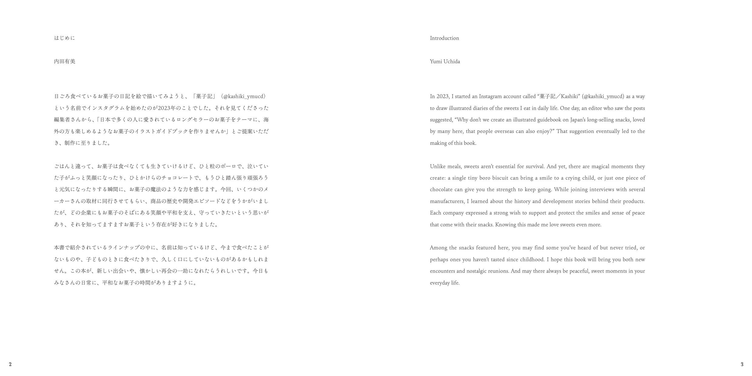 日ごろ食べているお菓子の日記を絵で描いてみようと、「菓子記」(@kashiki_ymucd)という名前でインスタグラムを始めたのが2023年のことでした。それを見てくださった編集者さんから、「日本で多くの人に愛されているロングセラーのお菓子をテーマに、海外の方も楽しめるようなお菓子のイラストガイドブックを作りませんか」とご提案いただき、制作に至りました。