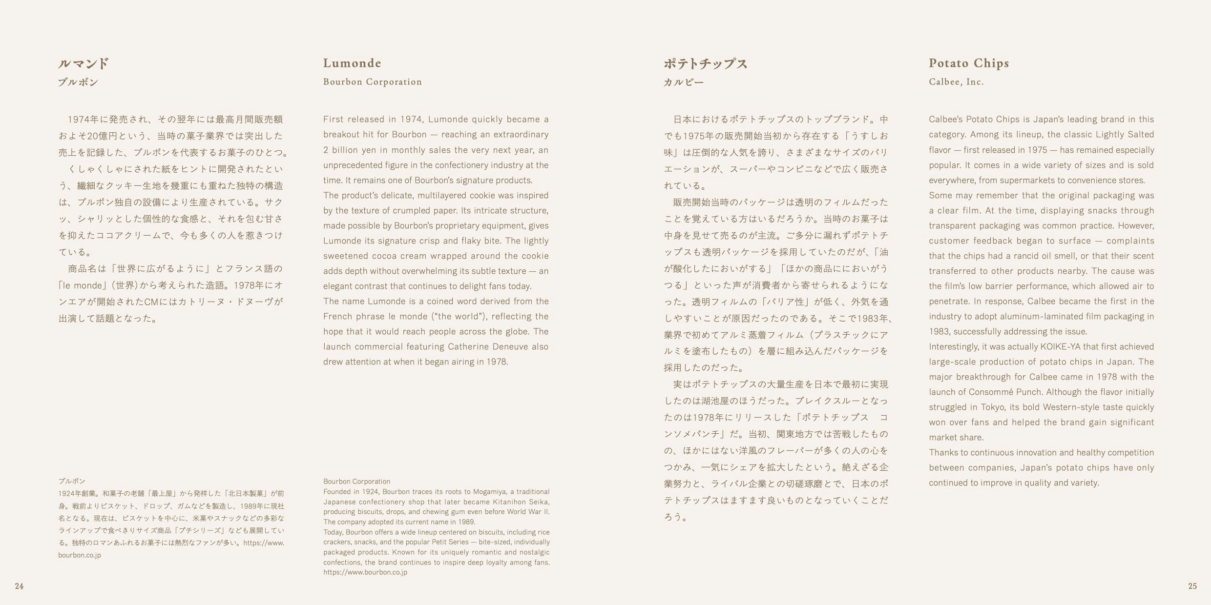食感を予感させるような「源氏パイ」のパイ生地の軽やかな層、カラフルな包装紙のやわらかな質感とその中に確かにある「ミルキー」の存在感、小さなチョコレートがたっぷり詰まった「チョコベビー」のプラスチック容器の透明感、「ジャイアントカプリコ」のあの唯一無二のエアリーな食感が伝わる表面の質感……。ぜひ本書をご覧になってご確認ください。