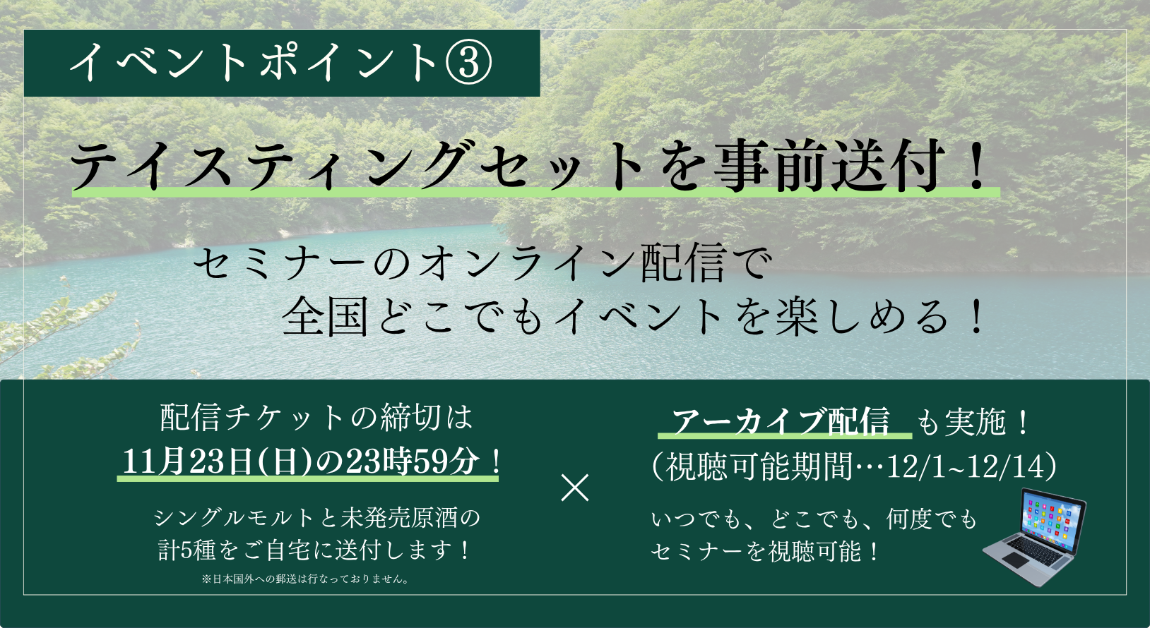 オンライン配信参加の皆様にも事前にテイスティングセットの送付を行います。全国どこからでも、井川蒸溜所の世界をお愉しみいただけます。