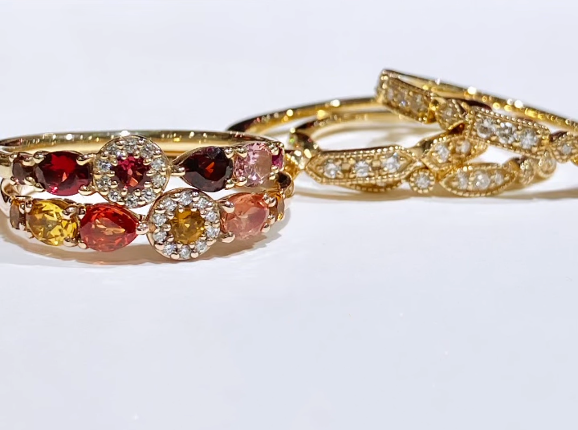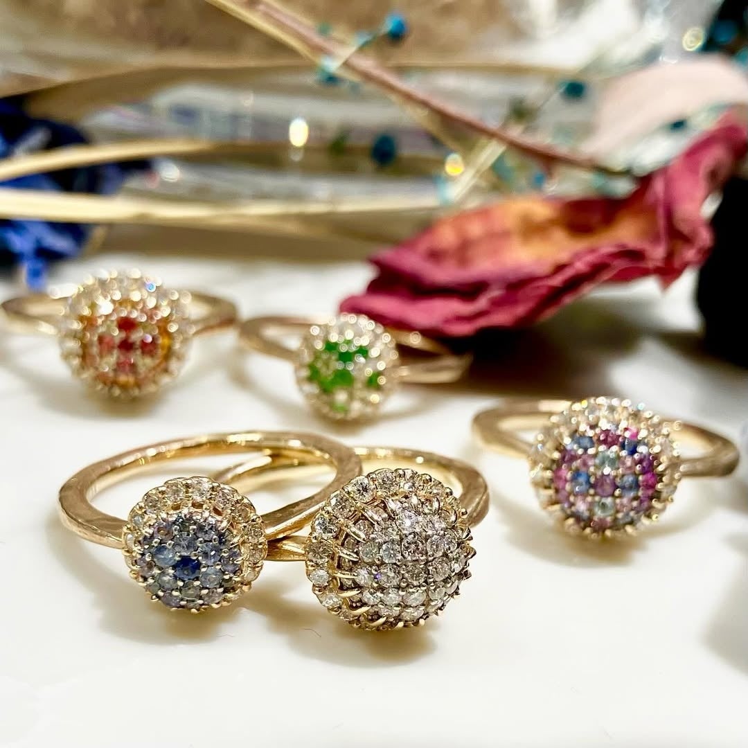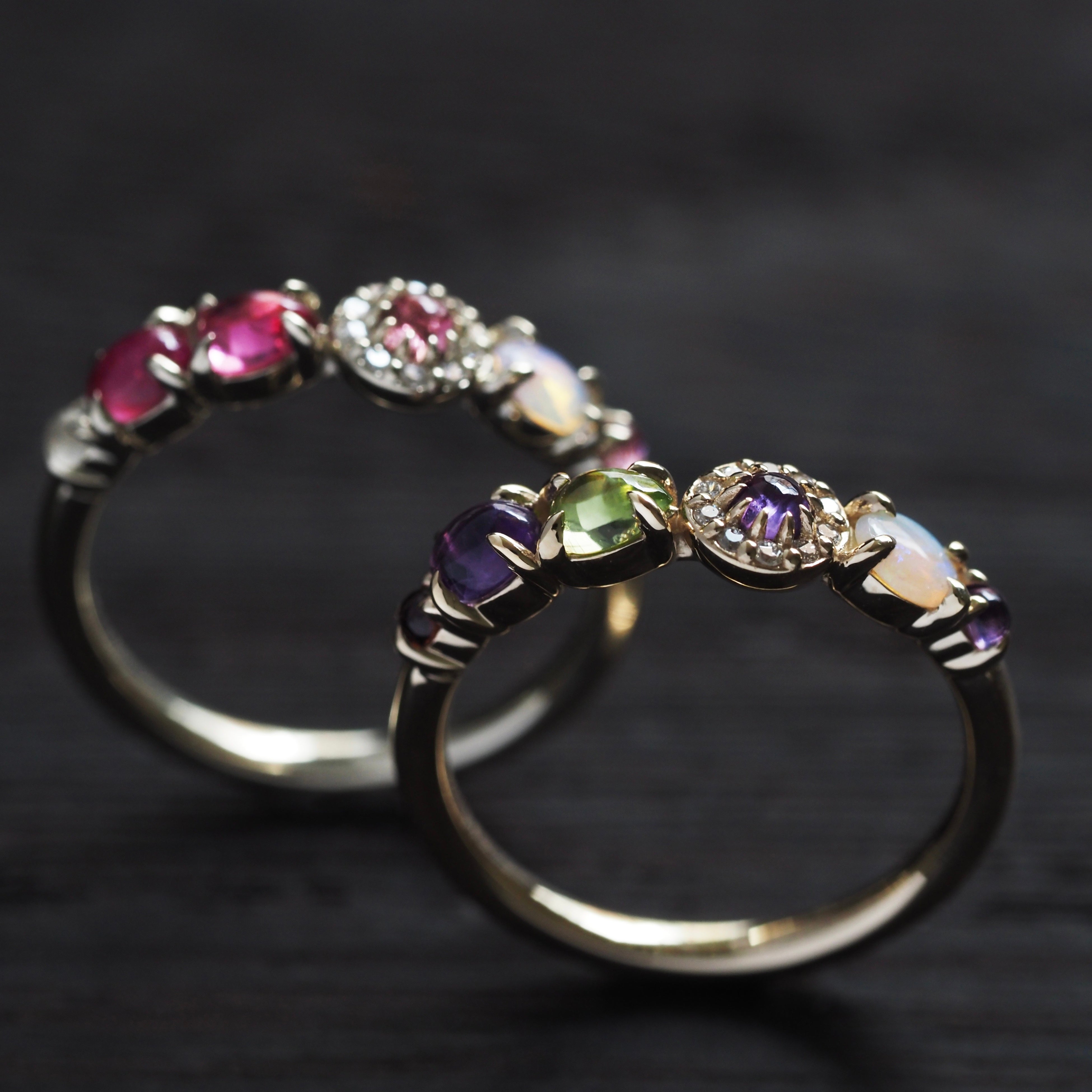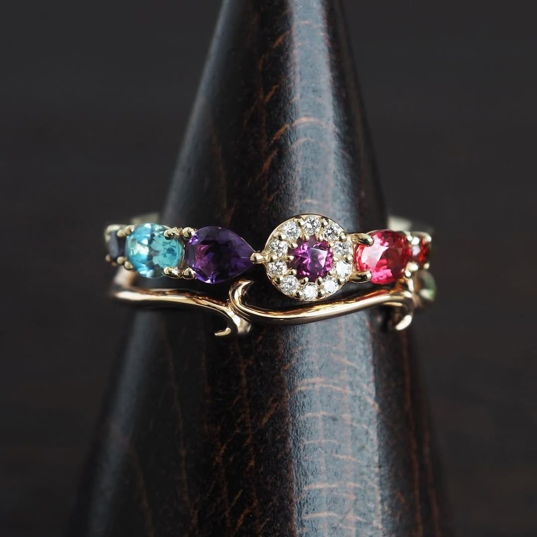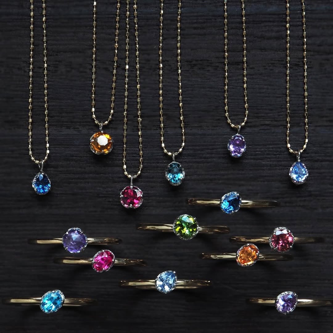 新作「Cocon(ココン)」は、3~4mmの小さなセンターストーンの下に、メレダイヤの輝きをそっと忍ばせた繊細なセッティングが特徴です。アメシスト、サファイア、トパーズ、ペリドット、トルマリンなど、さまざまなカラーストーンが重なり、光が溶け合うように手元を彩ります。