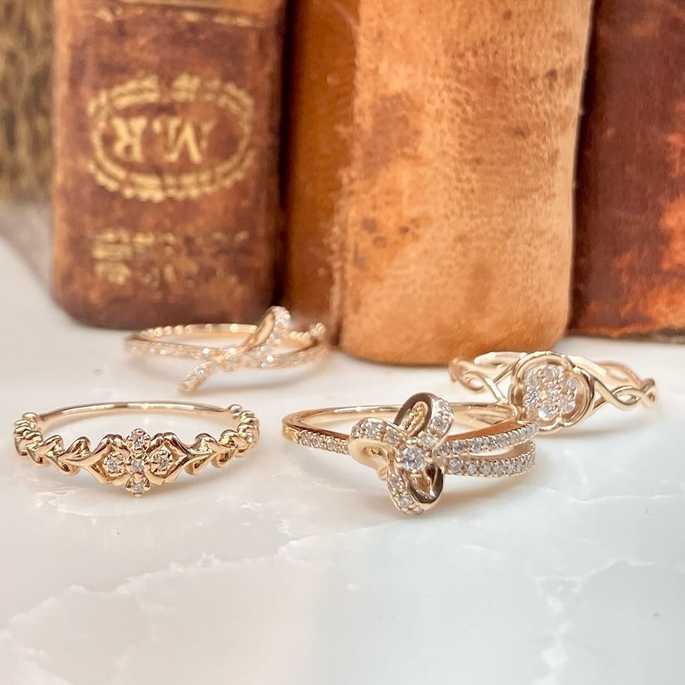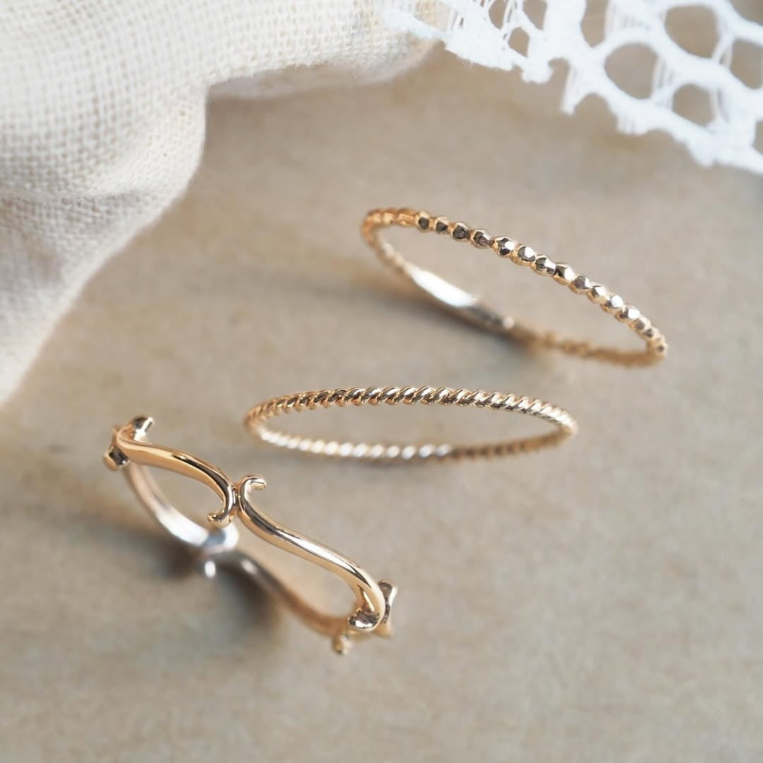 ロープのようなラインを一周に施したデザイン、小粒のストーンを並べた繊細なタイプ、そしてツタのようにしなやかに伸びるフォルム。どれもさりげなく個性を宿し、指先に優しい表情を添えます。