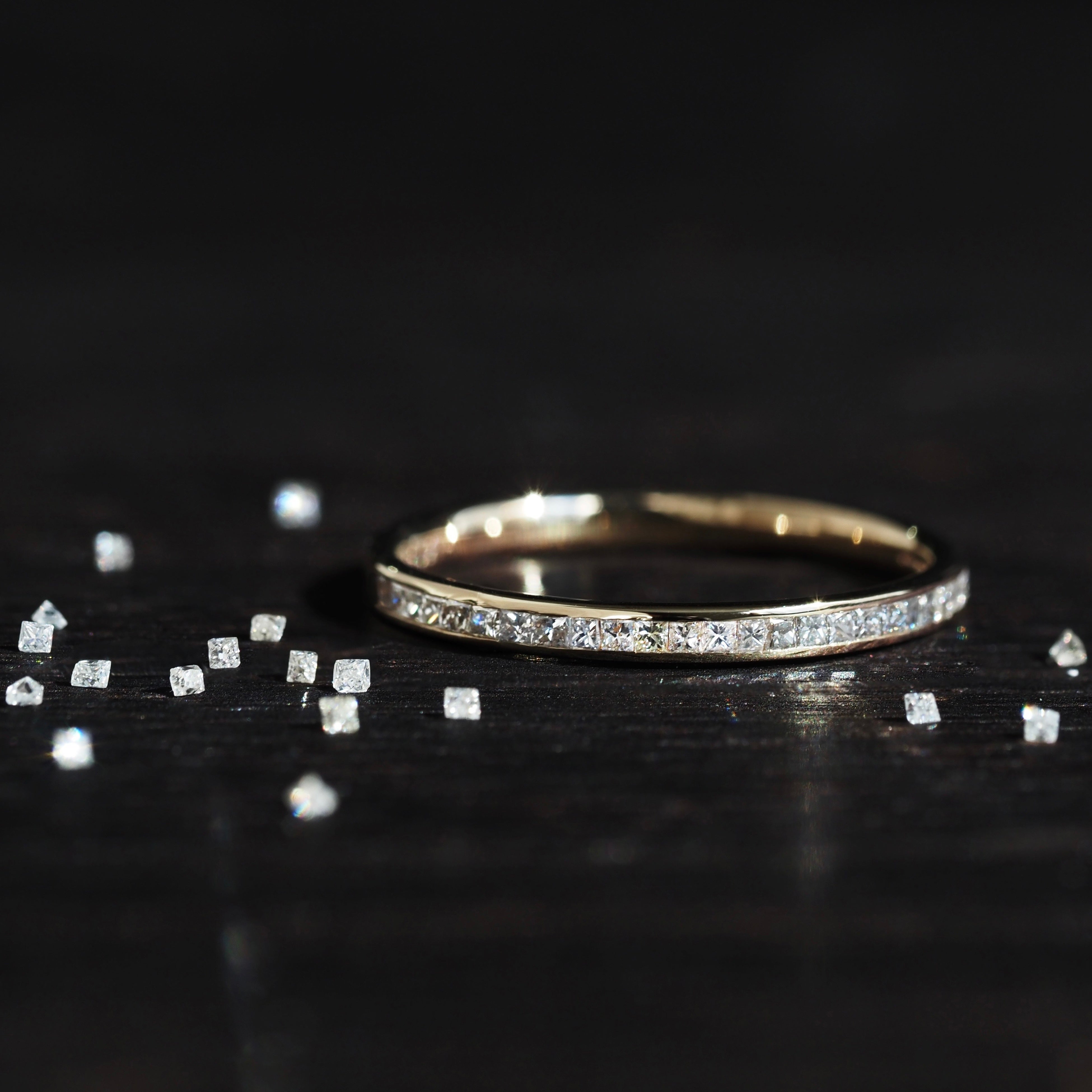 直線の美しさを際立たせたプリンセスカットのダイヤモンドを、レール留めで構築的に仕立てました。ぎゅっと敷き詰めたような存在感と、抜け感のあるシルエットが魅力です。流れるような光を纏う、洗練されたデザインです。