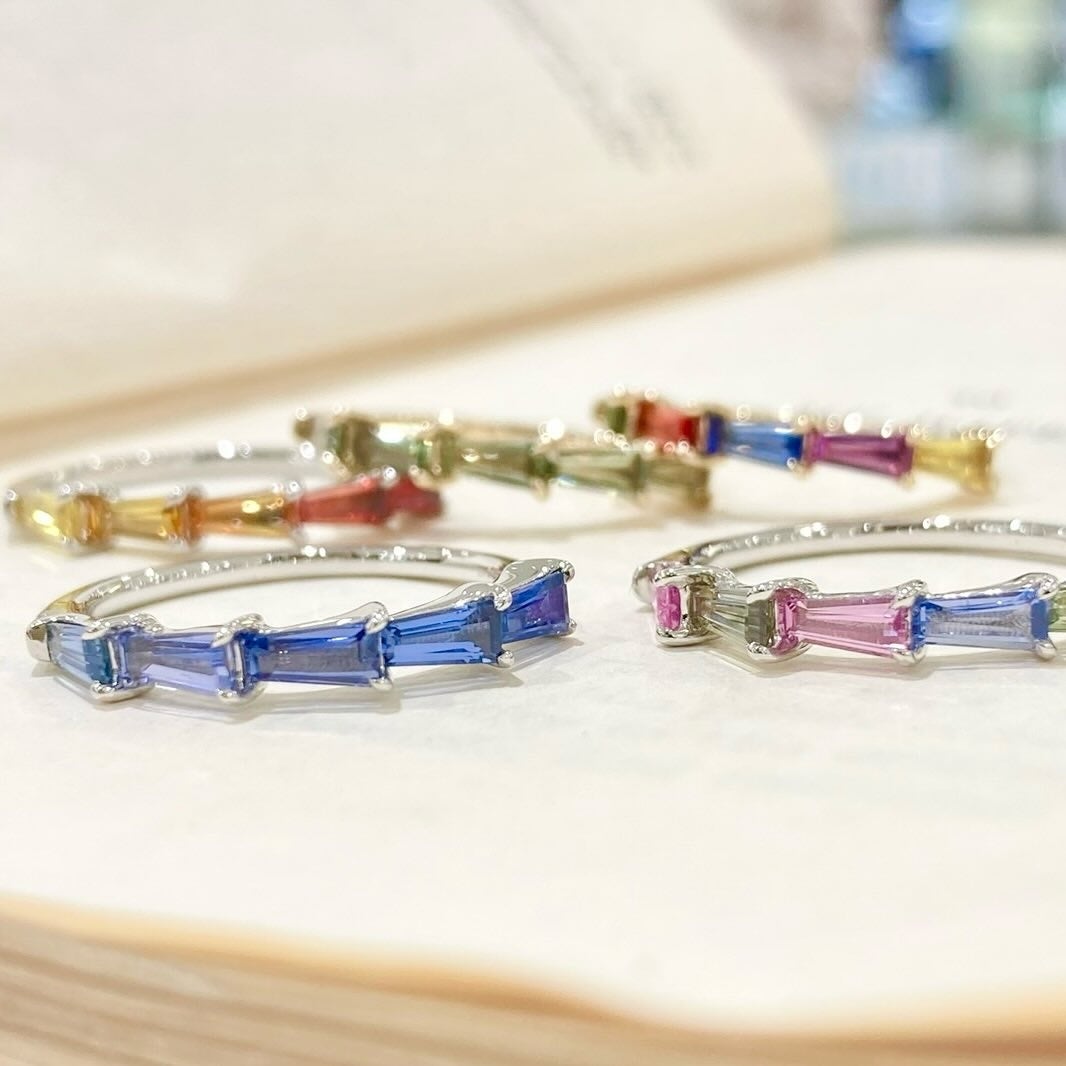 深みのあるブルー、希少なレッドトーン、そして華やかなマルチカラー。透明感を湛えたサファイアをグラデーションで配し、角度によって光の表情が変化するデザインです。知的でモダンな印象を指先に添えます。