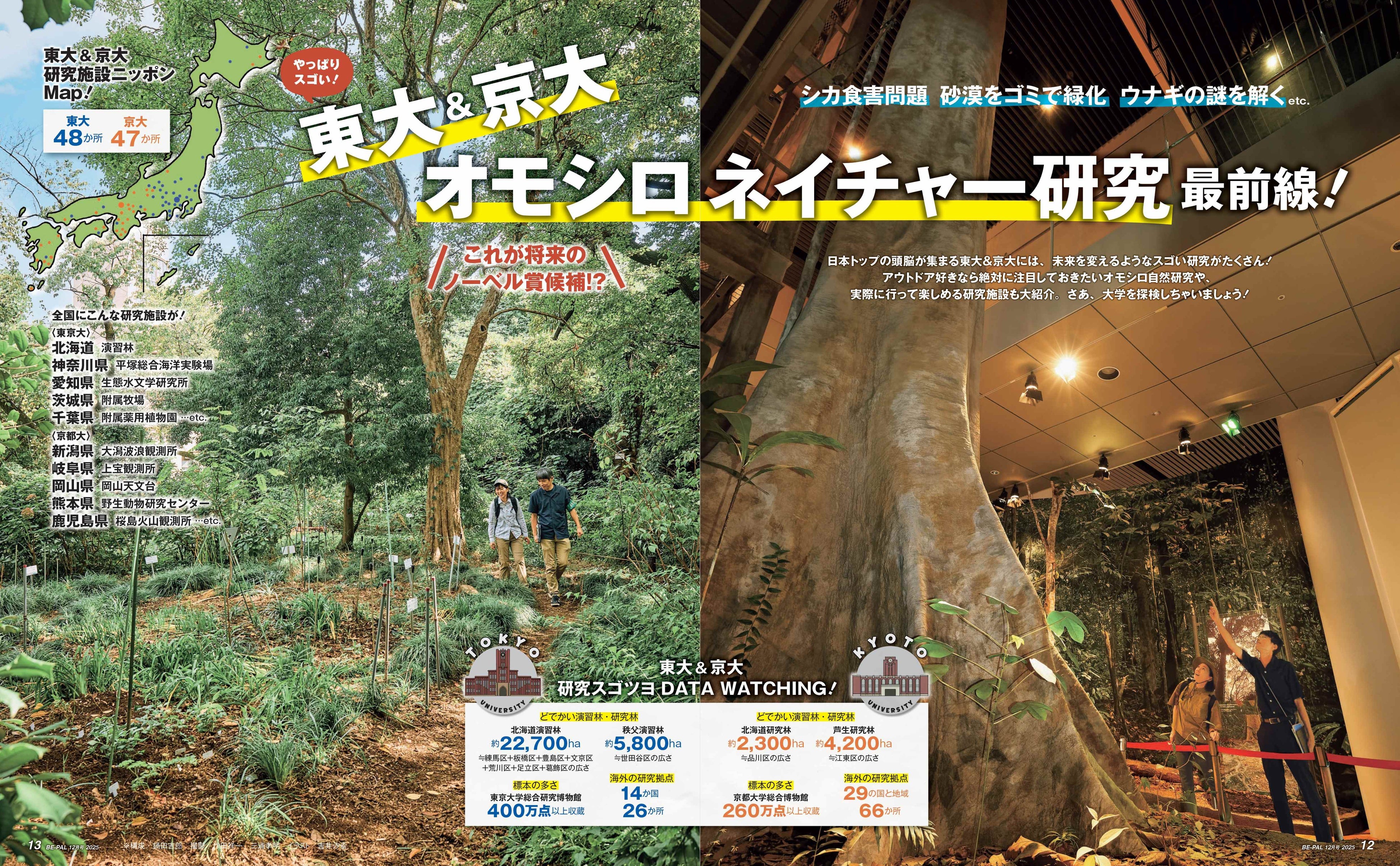 さらに、今号の大特集は「東大&京大 オモシロ "ネイチャー研究" 最前線!」。ノーベル賞受賞者を今年も輩出した京都大学、そして広大な演習林を持つ最強学府の東京大学。サンショウウオ研究の第一人者から、シカ食害問題やゴミで砂漠を緑化する研究者、ウナギの謎に挑む取り組みなどなど。自然派の心をくすぐる研究の最前線を徹底取材! 誰でも行ける東大&京大もありますよ!