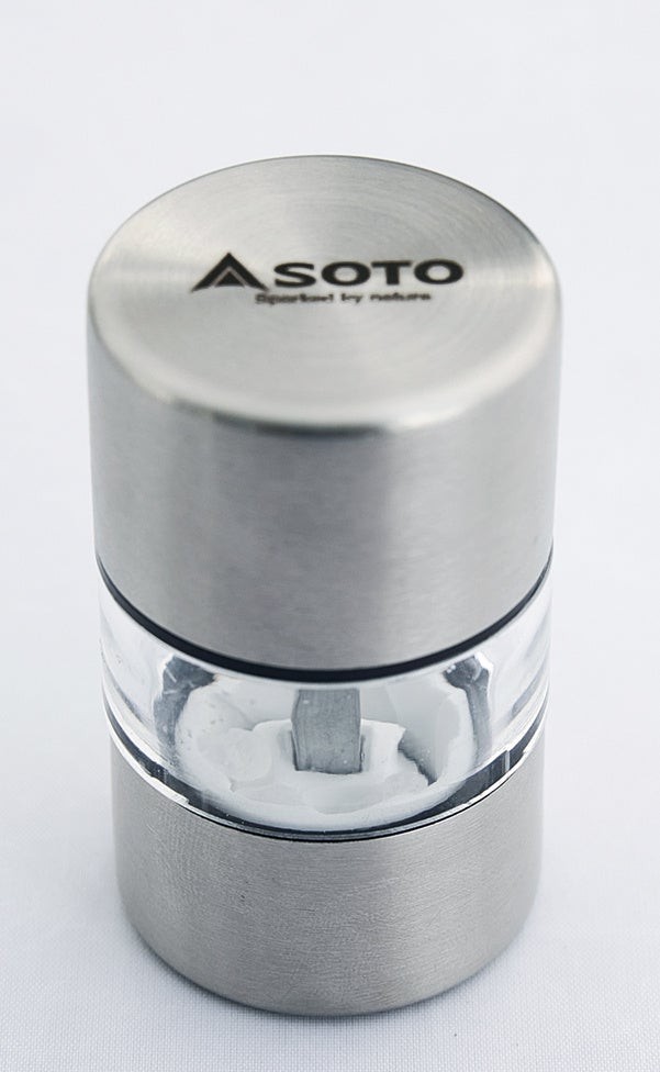 ステンレス製で天面には大人気ブランドのSOTOのロゴが入る。お気に入りのスパイスを仕上げにかければ、美味しさUP間違いなし!