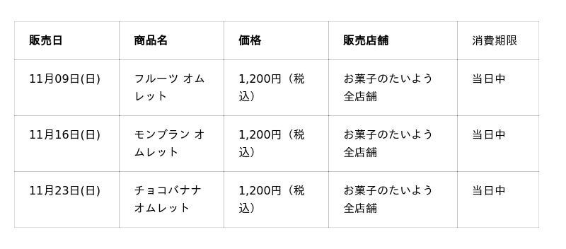株式会社太陽社(所在地:千葉県匝瑳市飯倉293、代表取締役:片岡正裕)が展開する、千葉県で長年愛され続ける菓子店「お菓子のたいよう」では、11月の3週にわたる"秋限定・週末スイーツフェス"として、【至福のオムレット3種】を日曜日限定で販売いたします。ふわっふわのスポンジと、世界が認めた生クリーム、そして地元で愛され続ける魅惑のカスタード。そこに、旬のフルーツ・濃厚マロン・まるごとバナナを限界まで詰め込んだ、"究極の爆盛りオムレット"が完成しました。