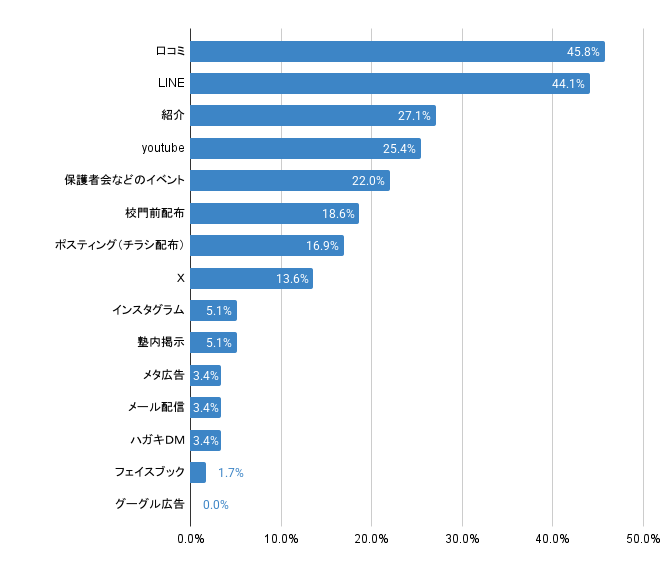 1位に「ポスティング(チラシ、校門前配布)」(57.6%)、次いで、「紹介」(47.5%)、「校門前配布」(44.1%)が並ぶ結果となりました。