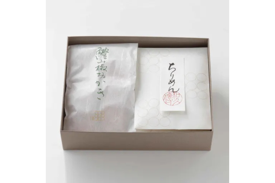 鱧山椒のおかきと、ちりめん山椒、冬菇椎茸、生姜鯛味噌茶漬けの和煮3種を詰め合わせた紫野和久傳ならではの一品。
