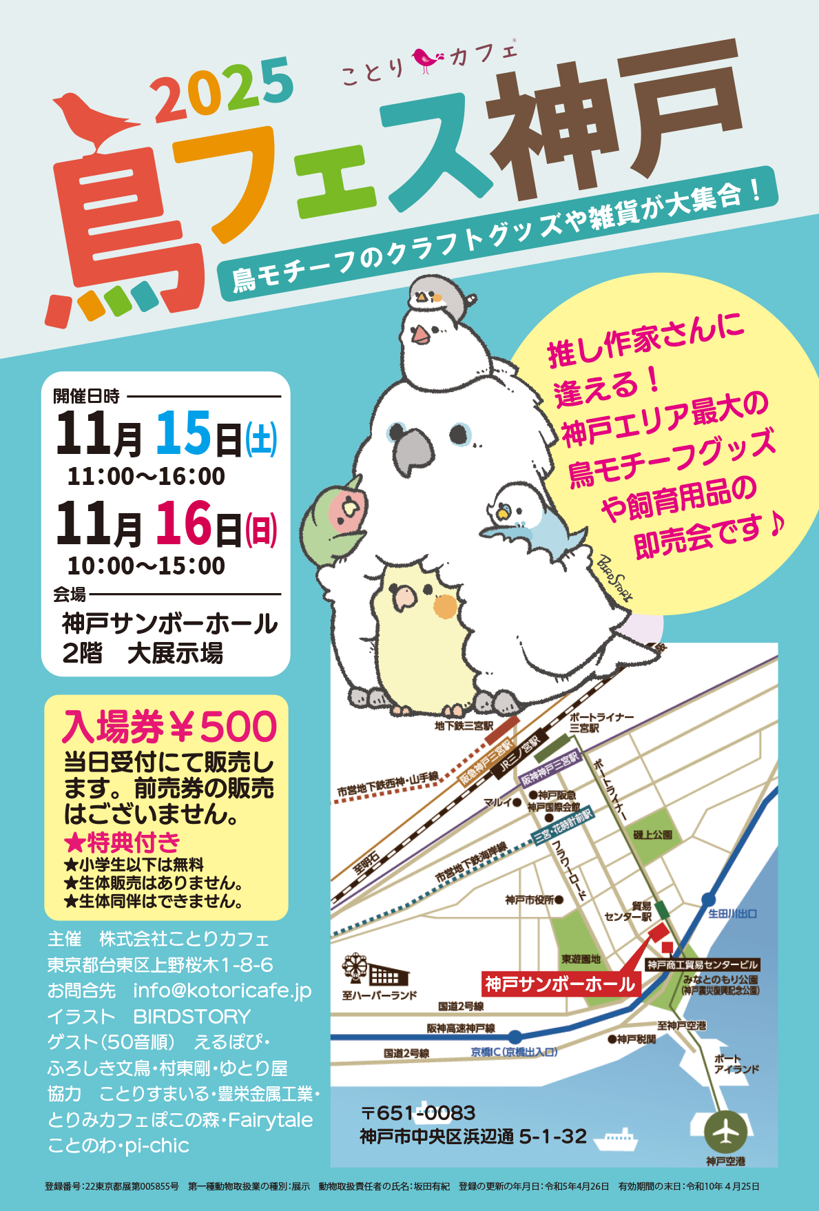 「小鳥たちを眺めながら、まったりコーヒータイム♪」をコンセプトにした「ことりカフェ上野本店」(http://kotoricafe.jp/)を運営する株式会社ことりカフェ(本社:東京都台東区 代表取締役 川部志穂)は、11月15日(土)・11月16(日)に「神戸サンボーホール」貿易センター駅より徒歩1分(https://kobe-sanbo.net/)にて、"鳥好きによる鳥好きのためのフェスタ"「鳥フェス神戸」(主催:ことりカフェ)を開催いたします。