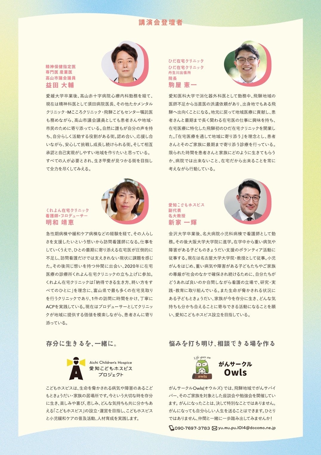 【飛騨高山・岐阜県高山市】「病気になってもありのままの自分で過ごせる居場所 ~緩和ケア・在宅ケア・小児緩和ケアを考える~」講演会が開催されます