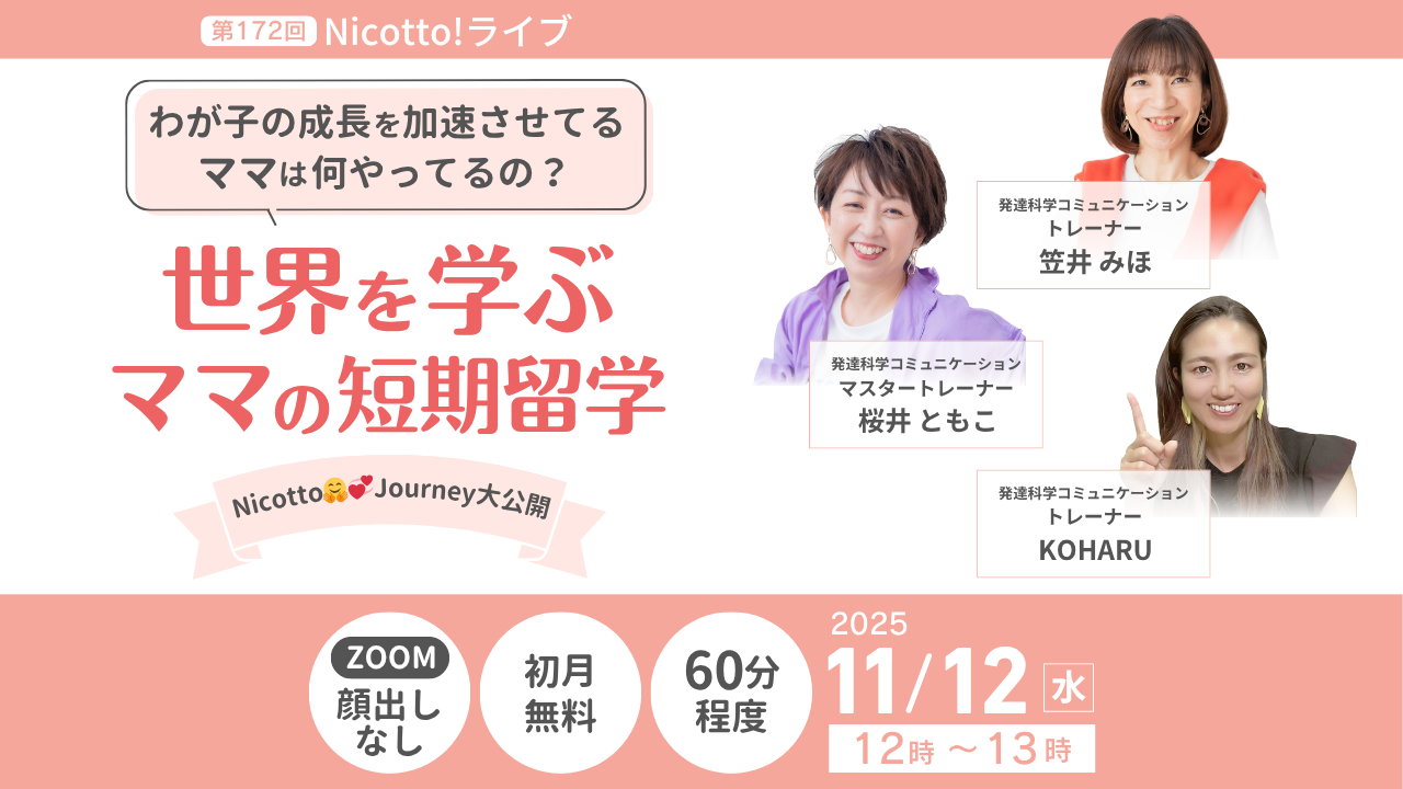 (株)パステルコミュニケーション(本社:東京都豊島区、代表取締役:吉野加容子)が運営する、発達障害・グレーゾーンの子どもを育てるママがいつでも学べて相談できるオンライン子育て塾「Nicotto!塾」は、2025年11月12日(水)お昼12時より、オンラインライブ「わが子の成長を加速させているママは何やってるの?世界を学ぶママの短期留学NicottoJourney大公開」をテーマにオンラインライブを開催いたします。https://desc-lab.com/nicotto202201/?prt1112