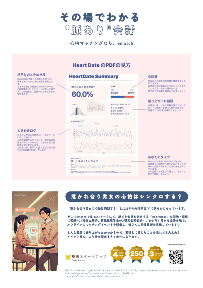 ematchは、株式会社e-lamp.が運営する、友活・恋活リアルイベント×心拍マッチング×コミュニケーション相談サービスです。本社拠点がある東京都渋谷を中心に、「同じ趣味」で繋がるコミュニティーイベントから、会話内容と心拍のシンクロ率から男女の相性が数値化できるデバイス"Heart Date"を活用したマッチング系イベントやセミナーの開催を行っております。イベント中は1人になっている席をつくらないイベント設計や、相手との会話内容や次に取るべきアクションがわかるツールを活用したイベントで高い満足度をいただいています。