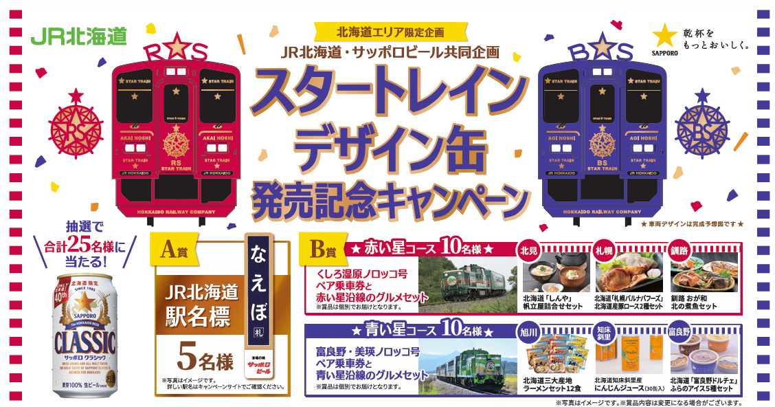 対象商品1,000円(税込)以上購入のレシートをWEBサイトにアップロードまたはハガキに貼付して郵送で応募していただくと、抽選で合計25名様にJR北海道の駅名標や、「赤い星」や「青い星」の各沿線にゆかりのある観光列車のペア乗車券とグルメのセットが当たります。