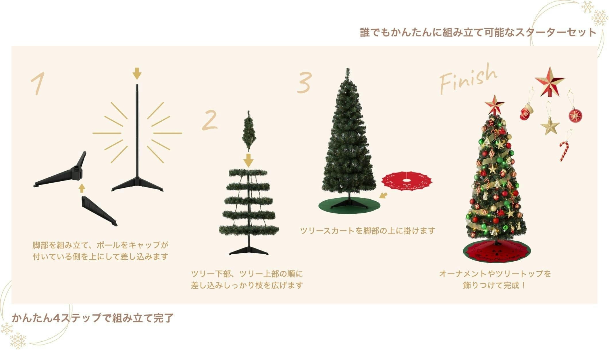 女性でも持てる軽さで、どなたでも簡単に組み立て可能。4ステップで完成する手軽さなので、小さなお子さまと一緒の飾り付けにもおすすめです。