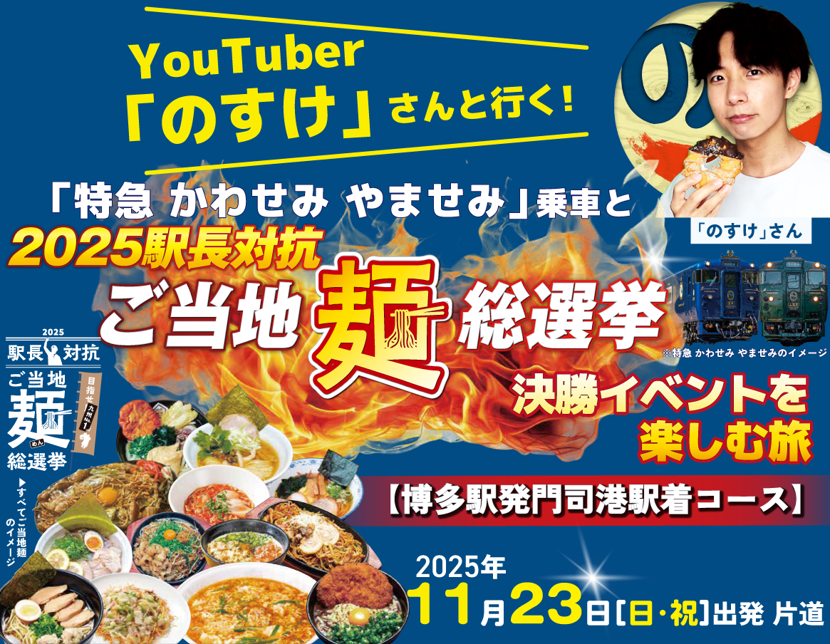 YouTuber「のすけ」さんと行く!「特急 かわせみ やませみ」乗車と2025駅長対抗「ご当地麺総選挙」決勝イベントを楽しむ旅 発売中!