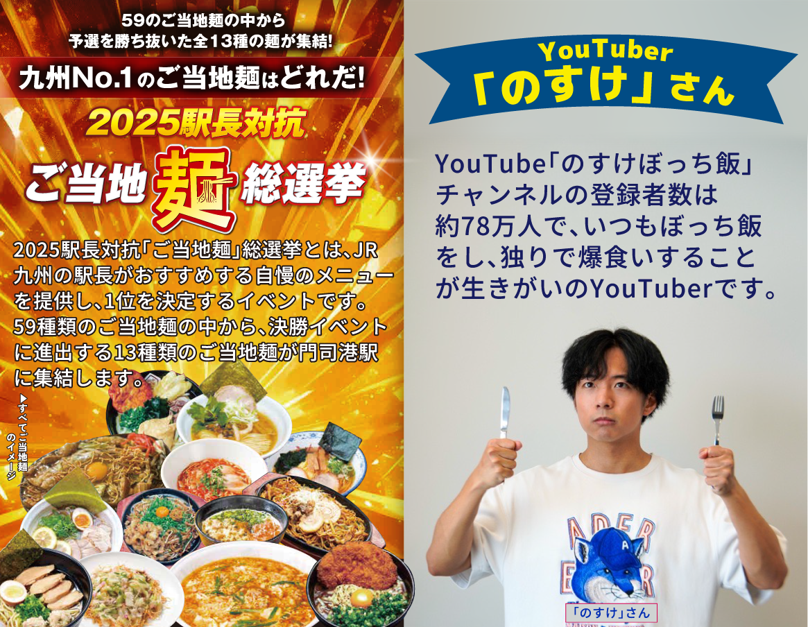 九州旅客鉄道株式会社(以下、JR九州)では、2025年11月23日(日・祝)に門司港駅前にて開催される、2025駅長対抗「ご当地麺」総選挙をお楽しみいただけるJR九州オリジナルツアーを発売中です。